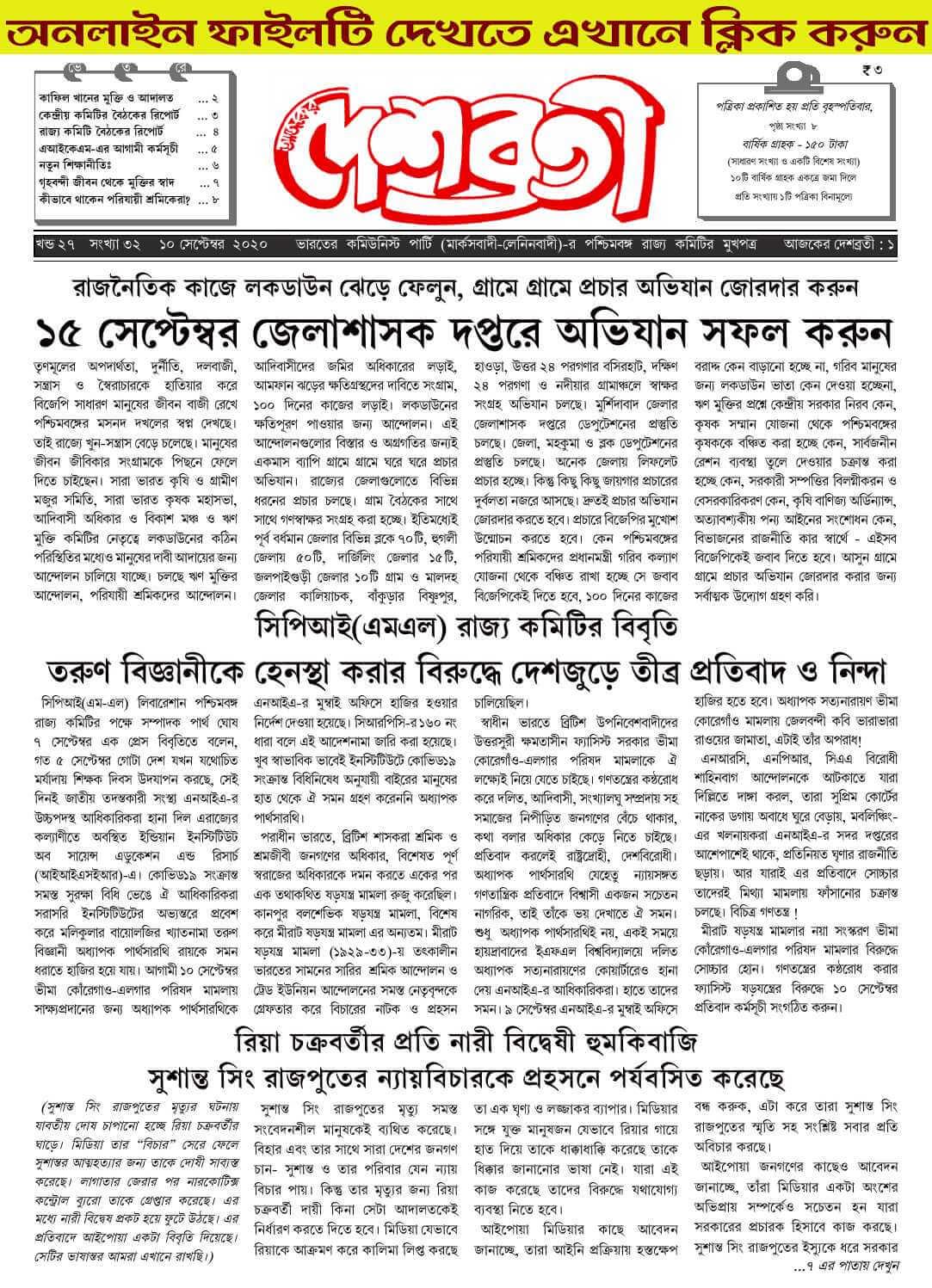 দেশব্রতী : খণ্ড ২৭, সংখ্যা ৩২ (১০ সেপ্টেম্বর ২০২০)