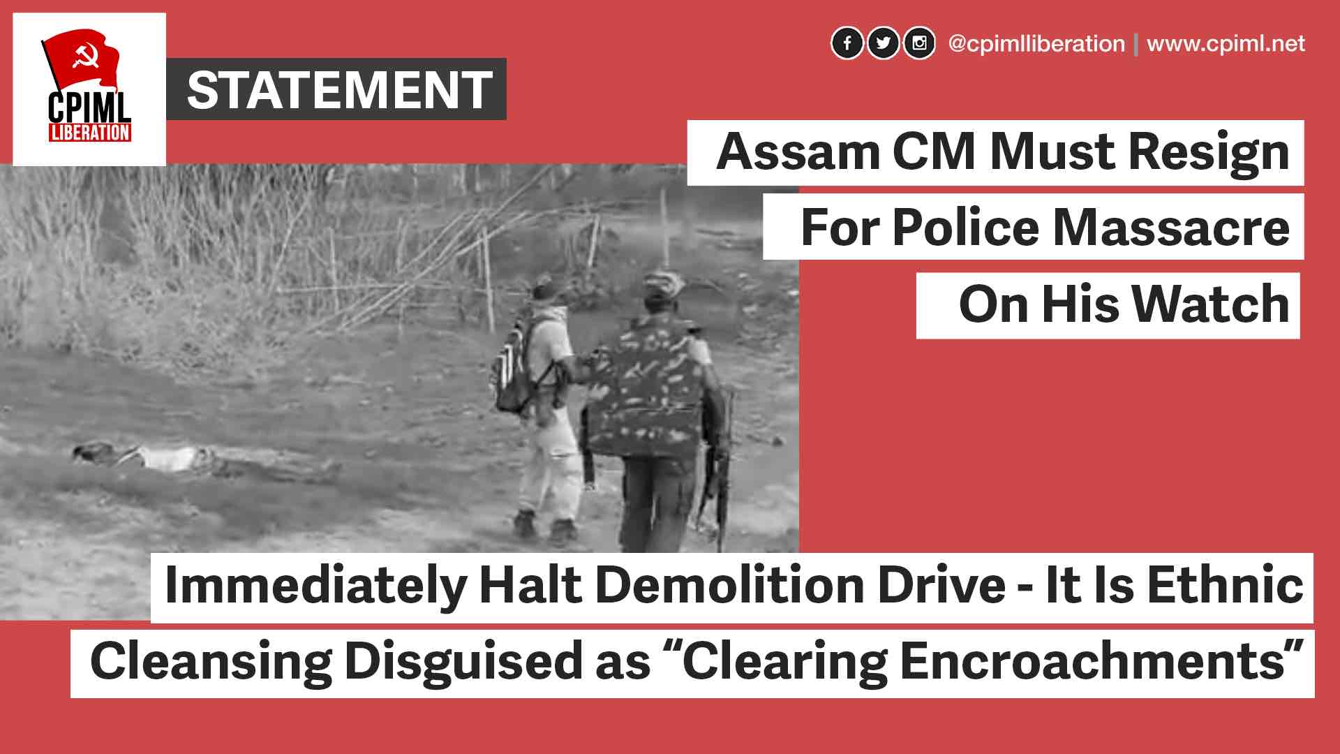 The Assam CM’s words on the demolition drive in Assam that led to this massacre also signalled the intention of ethnic cleansing. He had announced that “encroachments” were being demolished and “illegal immigrants” evicted so as to redistribute land among “indigenous Assamese” people. This language of snatching legally acquired land from certain communities deemed to be “illegal immigrants”, to hand over to other communities deemed “indigenous” is blatant xenophobia and ethnic cleansing. Killing is the inevitable next step. Thus it is imperative that the demolition drive be called off with immediate effect, and all those rendered homeless be rehabilitated on their lands without delay.