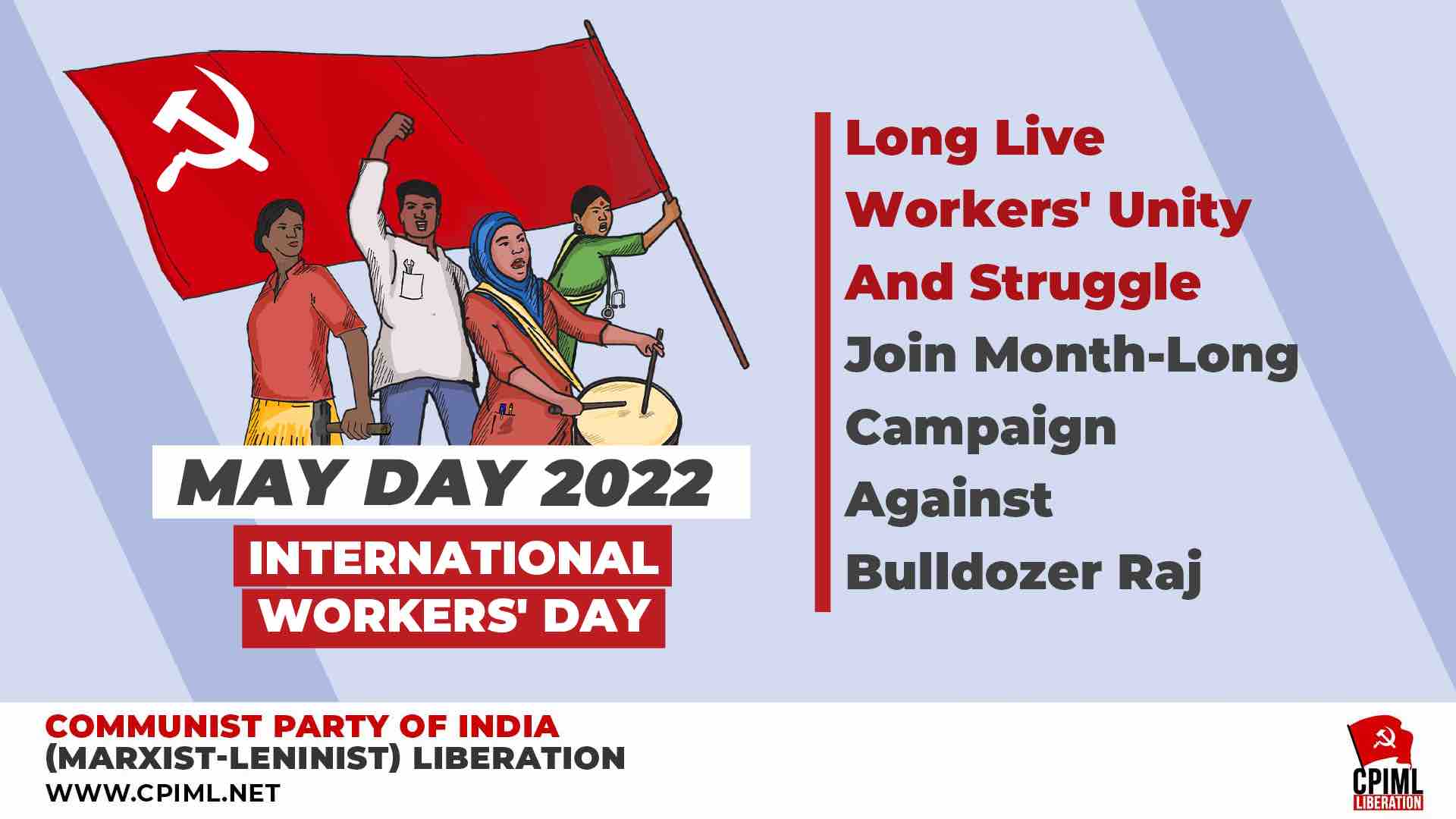 All over the country, the homes and livelihood of the poor (slums, unauthorised colonies, street-stalls and carts etc) are being demolished. BJP Governments and municipal corporations etc are especially singling out the Muslim poor, and sending bulldozers to demolish their homes, mosques, shops. This is being done on the pretext of "clearing encroachments" and also "punishing rioters", "evicting Bangladeshis and Rohingyas" etc. The BJP has turned the Bulldozer into a new symbol for itself: a symbol that declares its cruel anti-poor and anti-Muslim intent. The poor and working class all over India must resist this Bulldozer Raj. Whether Hindu, Muslim, Sikh, or Christian, we will say in one voice: Stop running the BJP Bulldozer over the shelter and livelihood of the poor; over harmony and fraternity in India; and over India's Constitution. On May Day 2022 (May 1) CPIML will begin a month-long all-India campaign to inspire people to resist Bulldozer Raj.