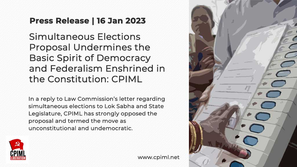 In a reply to Law Commission’s letter regarding simultaneous elections to Lok Sabha and State Legislature, CPIML has strongly opposed the proposal and termed the move as unconstitutional and undemocratic. The simultaneous elections will ring the death knell for democracy and federalism in the country. The proposed constitutional amendments to facilitate simultaneous elections amounts to a literal rewriting of the constitution and violates it's basic structure.