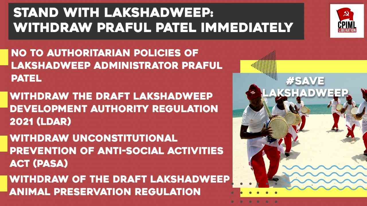 CPIML stands with the people of Lakshadweep in demanding the recall of Praful Patel as administrator, and the withdrawal of all orders issued or promulgated under his tenure.
