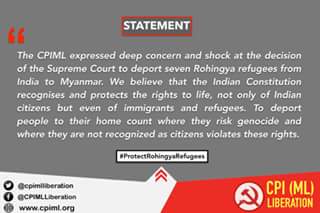 THE CPIML expressed deep concern and shock at the decision of the Supreme Court to deport seven Rohingya refugees from India to Myanmar. The Supreme Court has, disturbingly, accepted the argument of the Government of India that these men are "illegal immigrants", dismissing the facts which show that Rohingya people are not recognized as citizens in Myanmar and are therefore stateless. Moreover, Rohingya people are forced to flee a genocidal situation in Myanmar, and deportation to their home country violates the International principle of non-refoulement which has time and again been upheld by the Supreme Court of India on previous occasions – which means that refugees must not be deported back if they face danger to their lives in their home country.