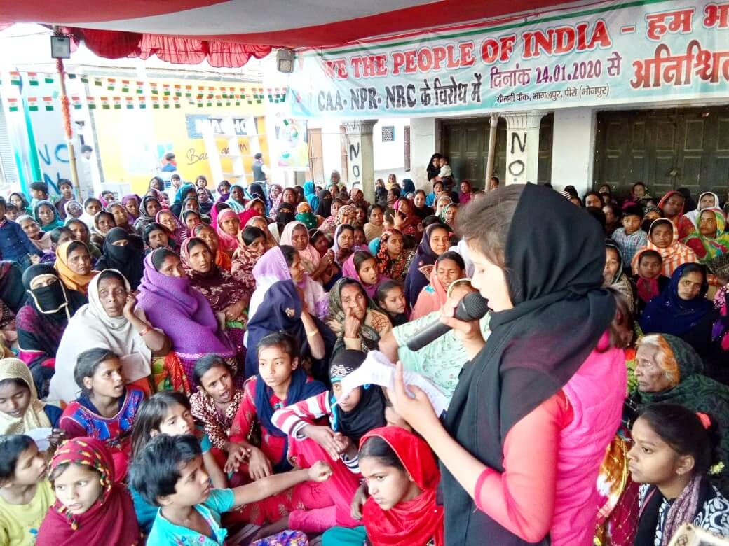 आरा के अबरपुल में मुख्य सड़क के किनारे (कामरान कम्प्लेक्स के सामने) मेन सडक के किनारे एनआरसी और सीएए को वापस लेने तथा एनपीआर रोक लगाने की मांग के साथ अनिश्चितकालीन धरना जारी है. यह धरना पर आयोजित है. इस आन्दोलन को शुरू करने के पहले कई रोज पुरूषों व महिलाओं की बैठकें आयोजित हुईं. युवाओं की भी अलग से बैठक की गई जिसमें इंसाफ मंच के संयुक्त सचिव मो. फैज अहमद उर्फ राजन ने मुख्य भूमिका निभाई. उनके साथ ही युवा नेता ऐनामुल हक, इजहार अली, शाहनवाज हुसैन के नेतृत्व में एक वर्किंग कमिटी का गठन किया गया है. साथ ही, उनकी हौसलाआफजाई व मदद के लिए एक सरपरस्त कमिटी का भी गठन किया गया है जिसमें जाकिर हुसैन, क्यामुद्दीन अंसारी (इंसाफ मंच के राज्य सचिव), मजहर हसनैन राजद नेता, ऐड्वोकेट मुख्तार अंसारी, इंसाफ मंच के आरा नगर संयोजक सत्यदेव कुमार, मुजफ्फर हुसैन, ऐडवोकेट अर्सद जफर साहब मुख्य भूमिका में है. इस तरह धरना की पहले से ही पूरी तैयारी कर ली गई.