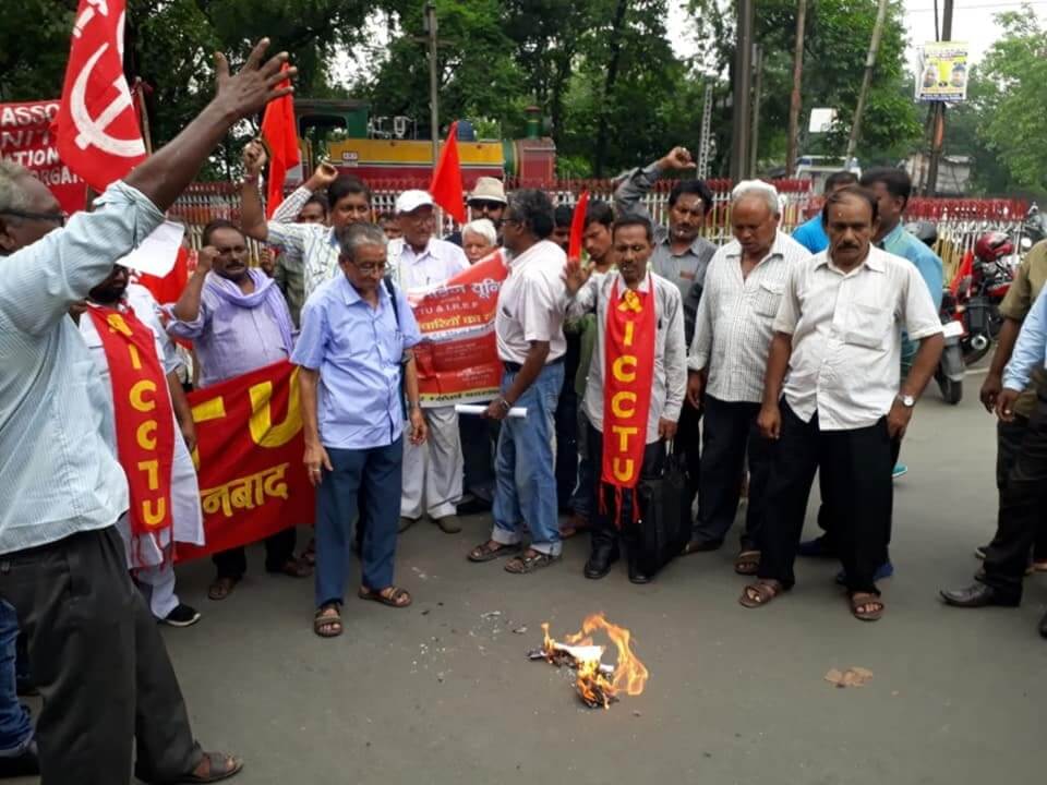 भुवनेश्वर में का. पीके महापात्र सहित अन्य कई साथियों की उपस्थित में भुवनेश्वर महाप्रबंधक कार्यालय पर धरना-प्रदर्शन करते हुए 100-डे ऐक्शन प्लान की प्रति जलाई गई.