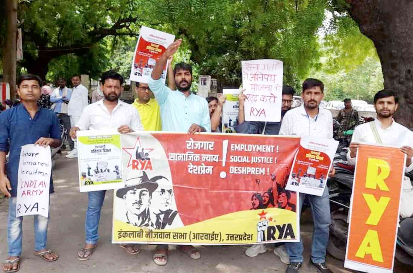सेना की बहाली में अग्निपथ योजना की वापसी की मांग को लेकर देशव्यापी प्रतिवाद कार्यक्रम के तहत 23 जुलाई इंकलाबी नौजवान सभा (आरवाइए) द्वारा उत्तर प्रदेश के कई जिला मुख्यालयों पर प्रदर्शन करते हुए सक्षम अधिकारी के द्वारा रक्षामंत्री को ज्ञापन भेजकर यह मांग की गई कि नौजवानों के भविष्य व देश की सुरक्षा से खिलवाड़ करने वाली अग्निपथ योजना को वापस लिया जाए.