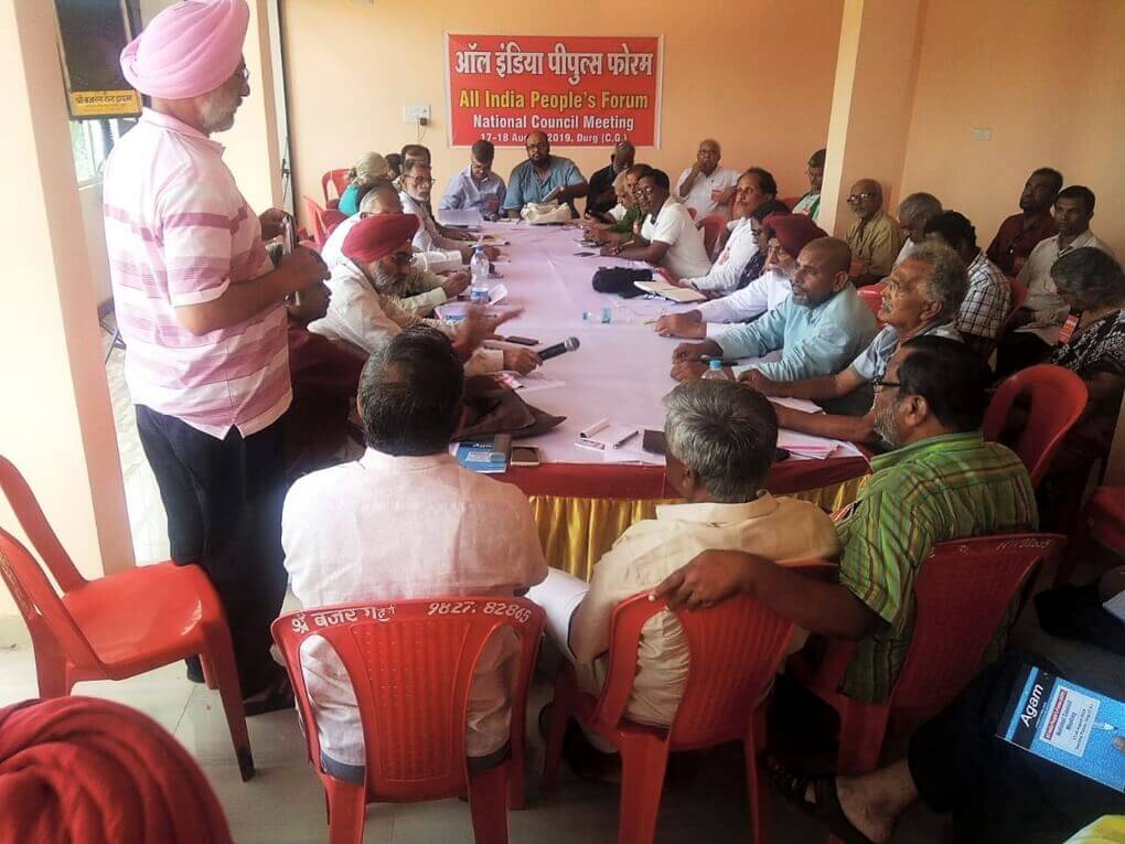 ऑल इंडिया पीपुल्स फोरम (एआइपीएफ) की राष्ट्रीय परिषद की दो दिवसीय बैठक 17-18 अगस्त 2019 को दुर्ग में संपन्न हुई. बैठक में छत्तीसगढ़ के अलावा मध्य प्रदेश, उत्तर प्रदेश, दिल्ली, बिहार, पंजाब, हरियाणा, झारखंड, कर्नाटक, पश्चिम बंगाल, ओडिशा आदि राज्यों के प्रतिनिधि शामिल हुए. बैठक में अगले एक माह सतत रूप से जम्मू-कश्मीर संबंधी केंद्र सरकार के अलोकतांत्रिक और असंवैधानिक निर्णयों के खिलाफ जन प्रतिरोध अभियान चलाने और 2 अक्टूबर को देश भर में “गांधीजी को जानो” कार्यक्रम आयोजित करने का निर्णय लिया गया, ताकि गांधी जी के राष्ट्रीय एकजुटता, हिन्दू मुस्लिम एकता, विकास की अवधारणा, तथा देश के बंटवारे का विरोध संबंधी विचारों को जन-जन तक पहुंचाया जा सके.