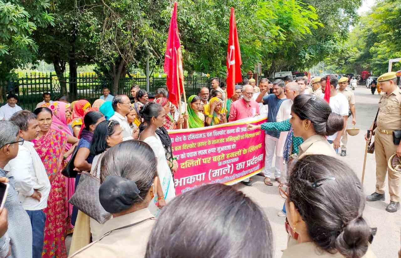 प्रदर्शनकारी महिलाएं ‘आरएस मिश्र अस्पताल में भ्रष्टाचार की जांच कराओ, भ्रष्टाचार में लिप्त कार्यवाहक चिकित्सा अधीक्षक को बर्खास्त करो, अस्पताल में बेहतर इलाज की व्यवस्था करो, अस्पताल को नर्क बना देने वाले डा. सुमित कुमार महराज समेत सभी को दंडित करो और रनियांमऊ के दलित नौजवान शिवम की हत्याकांड की उच्च स्तरीय जांच कराओ’ के नारे लगा रही थीं.