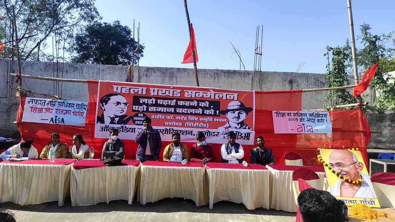 ऑल इंडिया स्टूडेंट्स एसोसिएशन (आइसा) ने राष्ट्रपिता महात्मा गांधी के शहादत दिवस (30 जनवरी) के मौके पर सरिया रोड स्थित शहीद कामरेड महेंद्र सिंह भवन, बगोदर में पहला प्रखण्ड सम्मेलन आयोजित किया. सम्मेलन में आइसा का 21-सदस्यीय प्रखंड कमिटी निर्वाचित की गई और सूरजदेव पासवान को प्रखंड अध्यक्ष, इमरान नजीर और राजश्री को उपाध्यक्ष तथा सुमन कुमारी व रीना कुमारी को सहसचिव चुना गया.