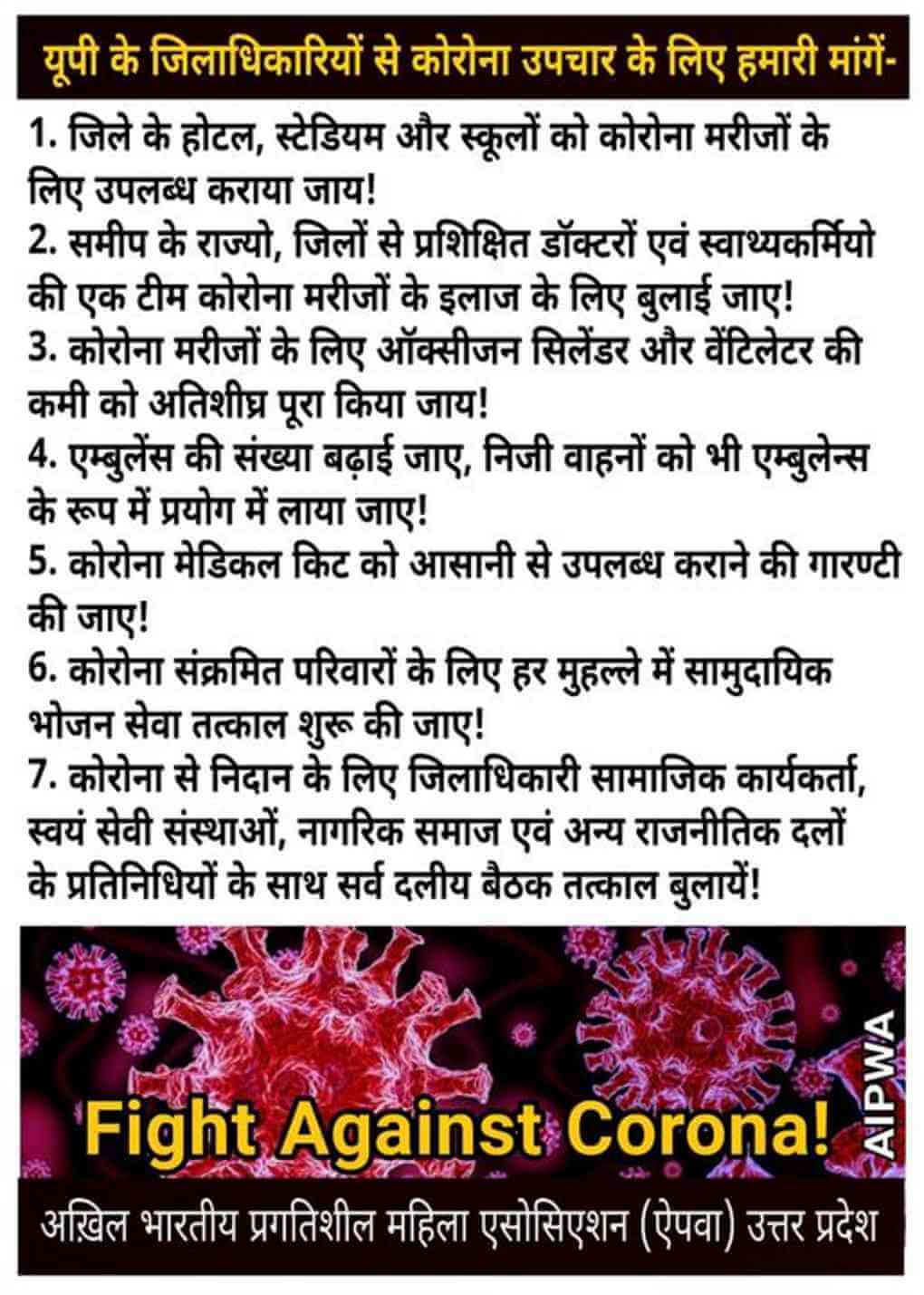 कोरोना के कारण चिंताजनक ढंग से हो रही मौतों एवं मेडिकल अव्यवस्था की ओर घ्यान दिलाने और साथ ही, इस विषम परिस्थिति में कोरोना के उपचार सम्बन्धी मांगों व सुझावों के साथ ऐपवा ने उत्तर प्रदेश के कई जिलाधिकारियों को पत्र भेजा.