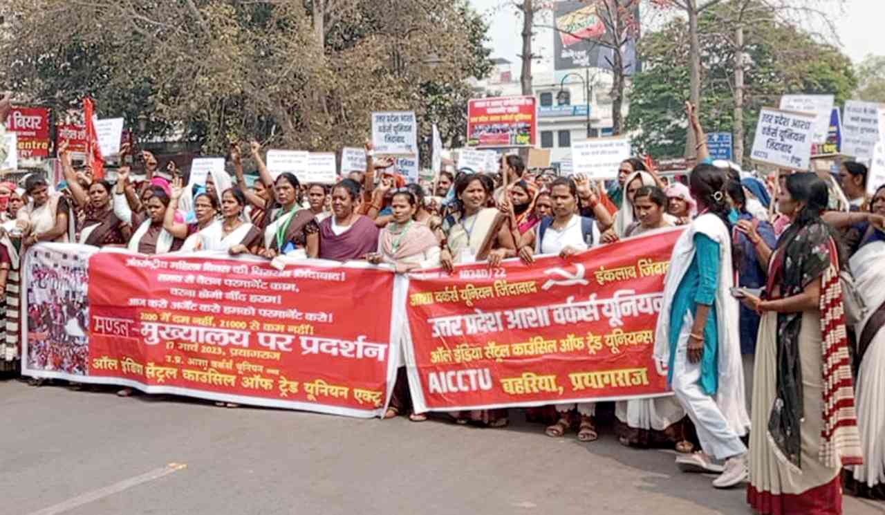 उत्तर प्रदेश में, जहां योगी राज पूरे देश में आतंक का पर्याय बना हुआ है, वहीं एक्टू से संबद्ध आशा वर्कर्स यूनियन की महिलाओं ने दमन का मुकाबला सड़कों पर करके भाजपा के महिला व मजदूर विरोधी चरित्र का पर्दाफाश किया है. कोरोना काल हो अथवा मातृ-शिशु मृत्यु दर को रोकने, स्वास्थ्य सेवाओं के मामले में आशा वर्कर्स की महत्वपूर्ण भूमिका के बावजूद उत्तर प्रदेश में आशा वर्कर्स की स्थिति दयनीय बनी हुई है. मोदी-योगी सरकार के सभी वादे झूठे साबित हुए. इसीलिए सरकार के विरोध में आशा वर्कर्स का संघर्ष लगातार बढ़ रहा है. उत्तर प्रदेश में आशाओं द्वारा 1 मार्च को 224 सीएचसी-पीएचसी पर, 3 मार्च को 79 तहसीलों पर, 13 मार्च को 46 जिला मुख्यालयों पर और 17 मार्च को 13 मंडल कार्यालयों पर जोरदार प्रदर्शन हुए. 1 मार्च 2023 की कार्य बंदी पर राष्ट्रपति, 3 मार्च को तहसील में प्रदर्शनों के बाद प्रधानमंत्री और 13 मार्च को मुख्यमंत्री को संबोधित मांग पत्र दिए गए. 17 मार्च को राष्ट्रीय स्वास्थ्य मिशन और भारत में विश्व स्वास्थ्य संगठन के प्रतिनिधि को संबोधित ज्ञापन दिए गए.