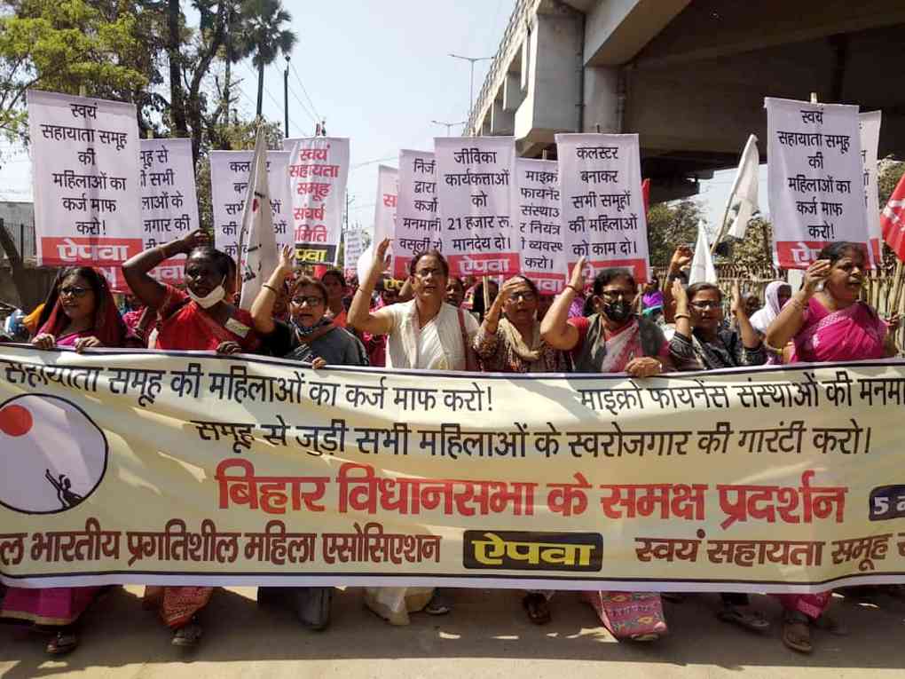 माइक्रो फायनेंस संस्थाओं की मनमानी पर रोक लगाने, महिलाओं का कर्ज माफ करने, ब्याज वसूली पर अविलंब रोक लगाने, कर्ज पर 0 से 4 प्रतिशत की दर से ब्याज लेने, स्वयं सहायता समूह की महिलाओं को अनिवार्य रूप से रोजगार देकर उत्पादों की खरीद करने, कर्ज के नियमन के लिए राज्य स्तरीय प्राधिकार का गठन करने, जीविका दीदियों को प्रतिमाह 21,000 रु. देने आदि मांगों को लेकर विगत 5 मार्च को पटना में स्वयं सहायता समूह से जुड़ी महिलाओं ने ऐपवा व स्वयं सहायता समूह संघर्ष समिति के संयुक्त बैनर से विधानसभा मार्च किया.