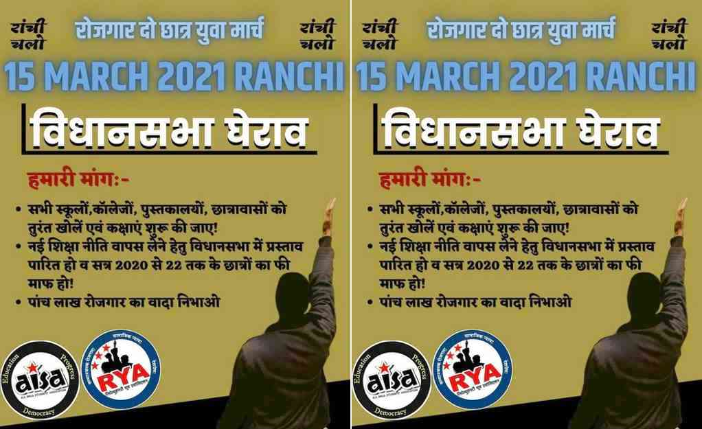 रोजगार के सवाल पर छात्र-युवाओं का आंदोलन लगतार तेज होता जा रहा है. बिहार में आइसा-इनौस द्वारा रोजगार, स्वास्थ्य व शिक्षा के सवाल पर विगत 1 मार्च को जुझारू विधानसभा घेराव किया गया. इसी तर्ज पर झारखंड के छात्र-युवाओं ने भी ‘हेमंत सरकार वादा निभाओ, रोजगार कहां है ये बतलाओ’ के केन्द्रीय आह्वान के तहत आगामी 15 मार्च को झारखंड विधानसभा के घेराव की तैयारी की है.