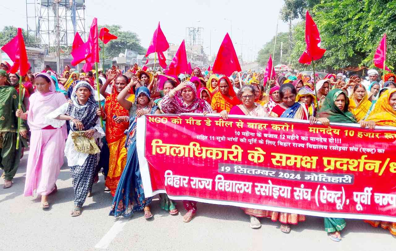 एनजीओ के पुनर्प्रवेश के खिलाफ 25 अगस्त से प्रखंडवार प्रदर्शन की घोषणा की. सुगौली, बंजरिया, हरसिद्ध, अरेराज, मधुबन, ढाका, चिरैया, घोड़ासाहन और मोतिहारी प्रखंड मुख्यालयों पर प्रदर्शन करते हुए 19 सितंबर को जिलाधिकारी के समक्ष प्रदर्शन किया गया. प्रदर्शन में जिले के 27 प्रखंडों से दो हजार से अधिक रसोइयों ने भाग लिया. प्रदेश महासचिव सरोज चौबे, जिलाध्यक्ष कुमांती देवी, सचिव दिनेश प्रसाद कुशवाहा, कोषाध्यक्ष छवि लाल महतो, शाहना खातून, मालती देवी सहित दर्जनों नेताओं की अगुआई में चिलचिलाती धूप के बावजूद लगभग 3 किलोमीटर दूर स्थित जिलाधिकारी कार्यालय तक जुझारू मार्च निकाला गया. जुलूस को आगे जाने से रोकने पर रोड जाम कर सभा आयोजित की गई जिसे भाकपा(माले) नेतो सिकटा विधायक का. वीरेंद्र प्रसाद गुप्ता, रसोइया संघ की महासचिव सरोज चौबे, जिला सचिव प्रभुदेव यादव, वरिष्ठ माले नेता भैरव दयाल सिंह सहित कई अन्य नेताओं ने संबोधित किया.