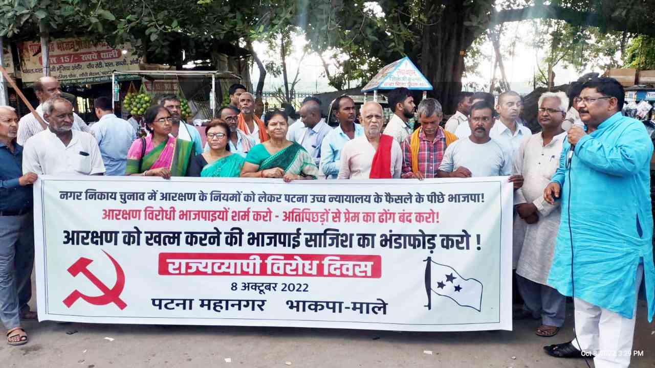 इसलिए निकाय चुनाव में पिछड़ों के आरक्षण में व्यवधान पैदा करने वाली भाजपाई साजिश का विरोध समय की मांग है. आरक्षण विरोधी भाजपा की साजिश के खिलाफ आगामी 8 अक्टूबर 2022 को भाकपा(माले) ने एक दिवसीय राज्यव्यापी विरोध कार्यक्रम की घोषणा की है. इसके तहत जिला मुख्यालयों पर विरोध मार्च, विरोध सभा या भाजपा के पुतला दहन का कार्यक्रम आयोजित होगा. इस कार्यक्रम में महागठबंधन की पार्टियों को भी यथासंभव आमंत्रित किया जायेगा.