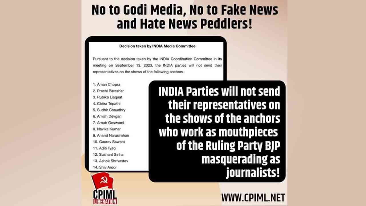 इंडिया गठबंधन के घटक दलों ने फैसला लिया है कि शासक भाजपा के प्रचारक बने गोदी मीडिया के एंकरों के शो में उनके प्रतिनिधि शामिल नहीं होंगे. इन एंकरों के नाम इस प्रकार हैं: