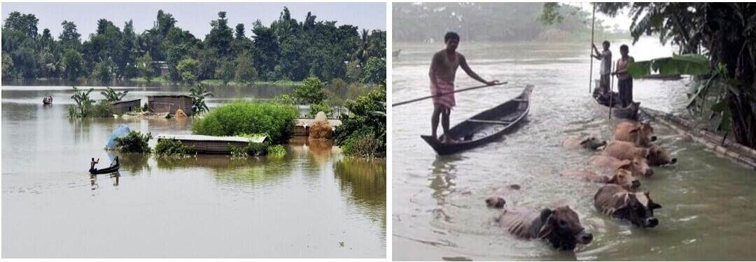 असम में, शुरूआती मानसून की वर्षा से आई भीषण बाढ़ के कहर के पहले ही चरण में राज्य के 33 जिलों के 57 लाख लोग उसका शिकार बन गये, और 36 लोग मौत का शिकार हुए. इसके अलावा सैकड़ों जानवर, जिसमें घरेलू पोसे गये पशु और जंगली जानवर भी शामिल हैं, मारे गये. अभी बाढ़ की दो और किश्तें या चरण आना बाकी है.