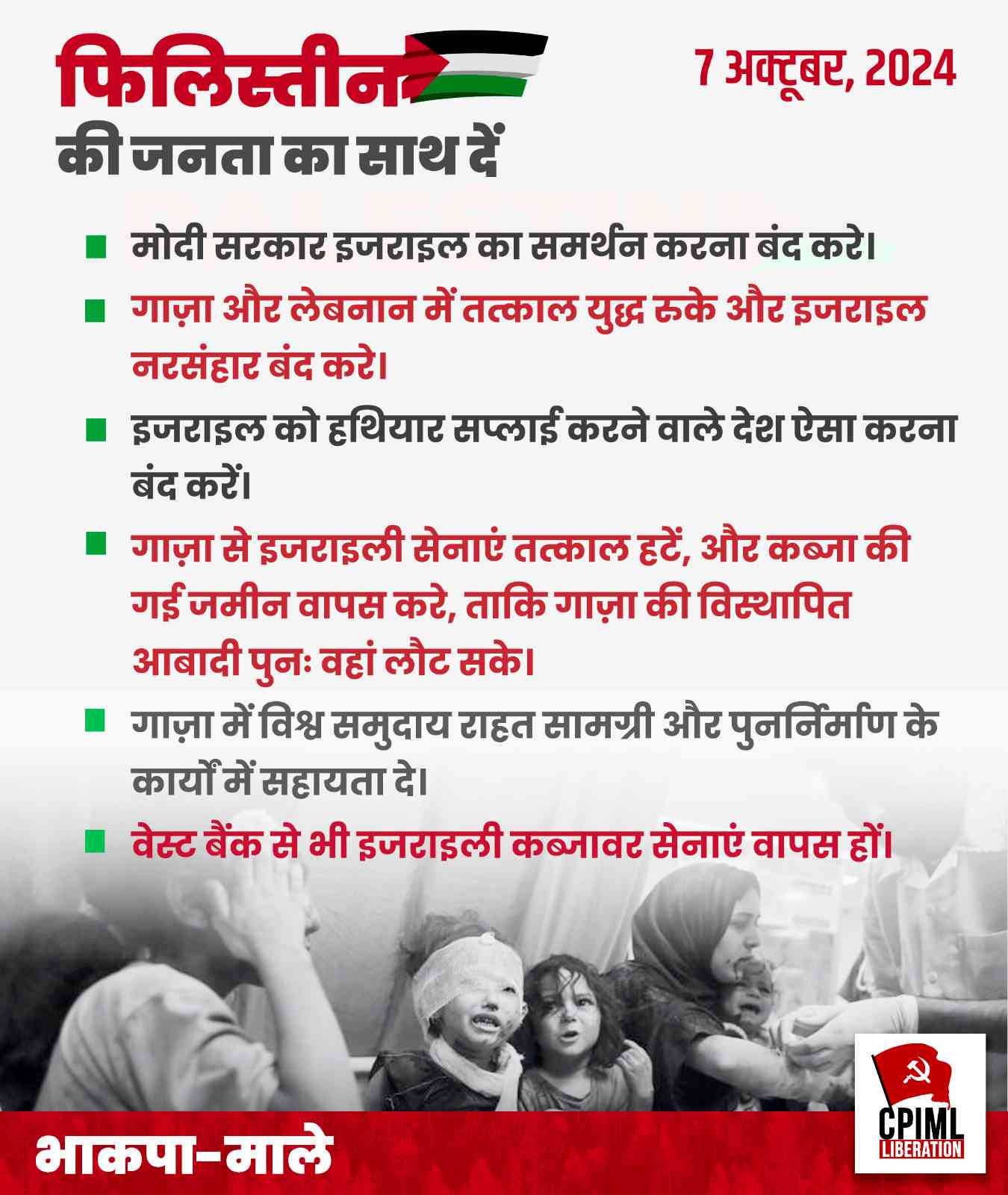 दुनिया भर में लाखों लोग इजरायली जनसंहार और युद्ध के खिलाफ विरोध प्रदर्शन कर रहे हैं और इस युद्ध को तत्काल समाप्त करने की मांग कर रहे हैं. इस बर्बर युद्ध की पहली वर्षगांठ पर, भारत के शांतिप्रिय लोग इस जनसंहारी युद्ध को तत्काल रोकने की मांग करते हैं. हम सभी वामपंथी दल 7 अक्टूबर, 2024 को तत्काल युद्धविराम और शांति बहाल करने के लिए प्रदर्शन और बैठकें आयोजित करेंगे. इस दिन हम भारत सरकार से भी अपील करेंगे कि वह इजरायल को सभी हथियारों के निर्यात को बंद करे और ‘द्वि राष्ट्र समाधान’ के लिए काम करे ताकि स्वतंत्र फिलिस्तीनी राज्य अस्तित्व में आ सके.