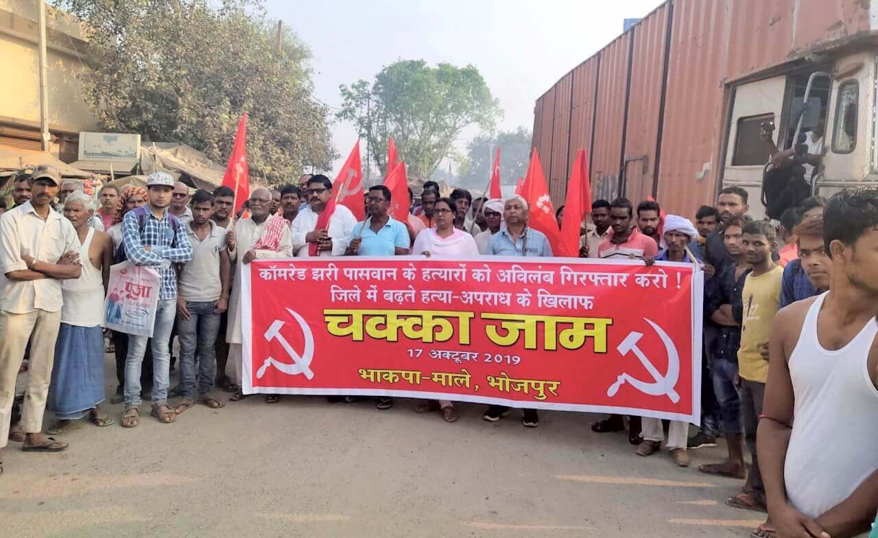 जिले में बढ़ते हिंसा व अपराध के खिलाफ, जिसका एक उदाहरण भाकपा(माले) के पूर्व सदस्य का. झरी पासवान की तरारी थाना के सामने ही हत्या कर देने के रूप में पिछले दिनों सामने आया है, भाकपा(माले) ने विगत 17 अक्टूबर 2019 को भोजपुर का चक्का जाम किया. जाम को जिले के विभिन्न जगहों पर भारी जनसमर्थन मिला.