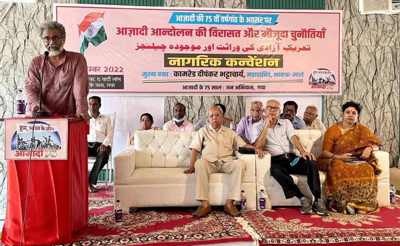 आजादी की 75वीं वर्षगांठ के मौके पर गया के बगीचा लॉन में विगत 22 सितंबर को ‘आजादी आंदोलन की विरासत और मौजूदा चुनौतियां’ पर एक नागरिक कन्वेंशन का आयोजन किया गया. भाकपा(माले) के महासचिव कामरेड दीपंकर भट्टाचार्य इसमें मुख्य वक्ता के बतौर शामिल हुए.