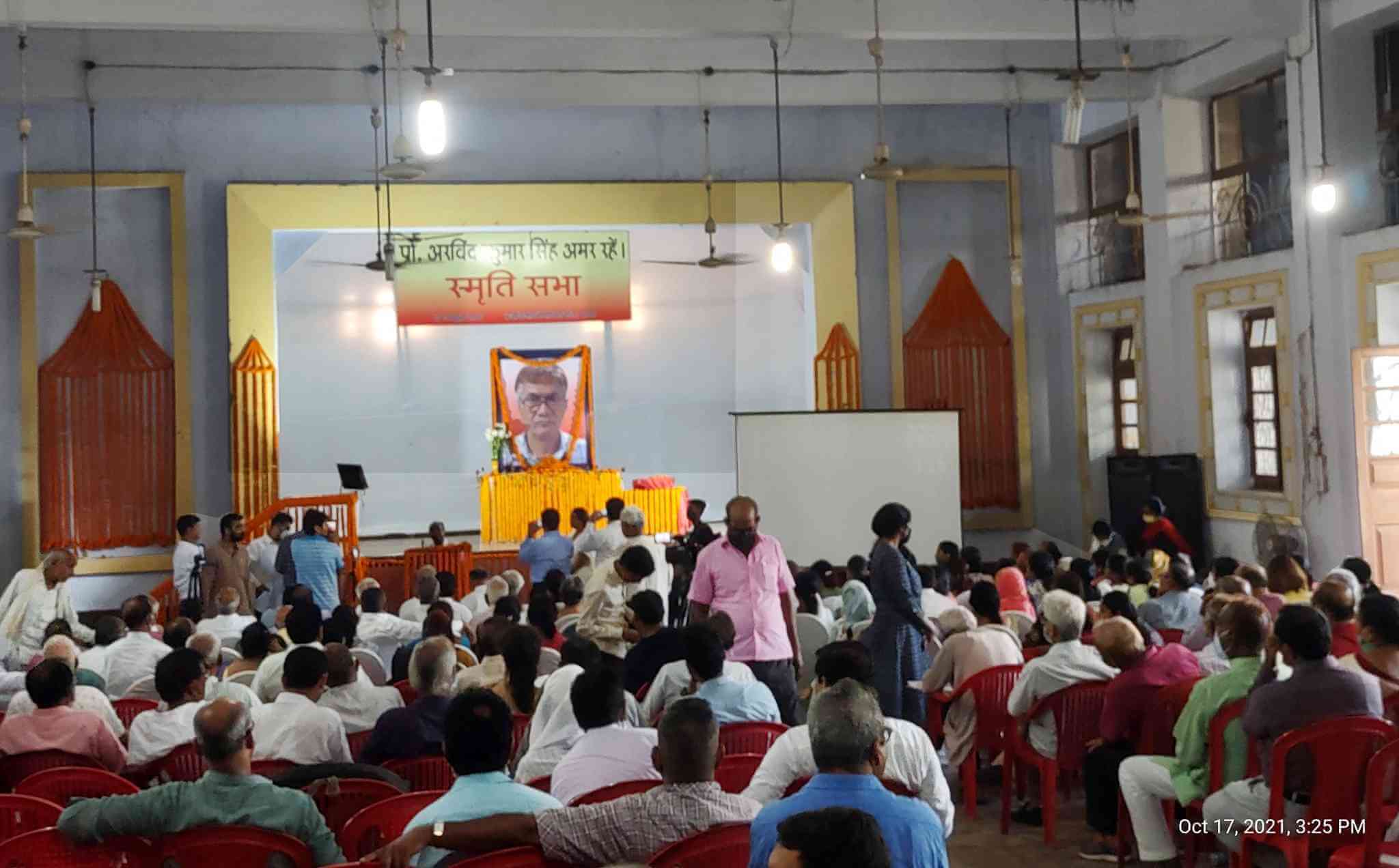रविवार, 17 अक्टूबर 2021 को कुर्जी स्थित ब्रज किशोर मेमोरियल भवन में कामरेड प्रो. अरविंद कुमार की स्मृति सभा आयोजित की गयी. कामरेड अरविंद ने 1980 के आसपास भाकपा(माले) लिबरेशन से जुड़े और तब से लेकर अपने अंतिम क्षणों तक पार्टी के सक्रिय सदस्य के बतौर कार्य करते रहे. भाकपा(माले) के कई पत्र-पत्रिकाओं जैसे - समकालीन जनमत, लोकयुद्ध, श्रमिक सॉलिडेरिटी आदि के प्रकाशन के काम से आजीवन जुड़े रहे. भाकपा-माले के पूर्व महासचिव विनोद मिश्र की संकलित रचनाओं के प्रकाशन में उनकी अहम् भूमिका रही थी. साल 2019 में हुए एक दुर्घटना के बाद उन्हें कई प्रकार के शारीरिक संकटों से गुजरना पड़ा. 2021 में कोविड के दूसरे उभार में 12 अप्रैल को वे कोविड से संक्रमित हो गए. 14 अप्रैल को पटना के रुबन अस्पताल में उन्हें भर्ती कराया गया था. उनकी तबियत लगातार बिगड़ती गयी और अंततः 10 मई 2021 को लगातार दो हार्ट अटैक आने से वे हमारे बीच नहीं रहे. प्रतिकूल परिस्थितियों में उनके चले जाने के कारण उनके परिजन, निकट संबंधी, सहकर्मी, साथी व छात्र आदि उन्हें अंतिम विदाई भी नहीं दे सके थे. स्मृति सभा के आयोजन से उनके चाहनेवालों ने उन्हें याद कर उन्हें श्रद्धांजलि अर्पित की.