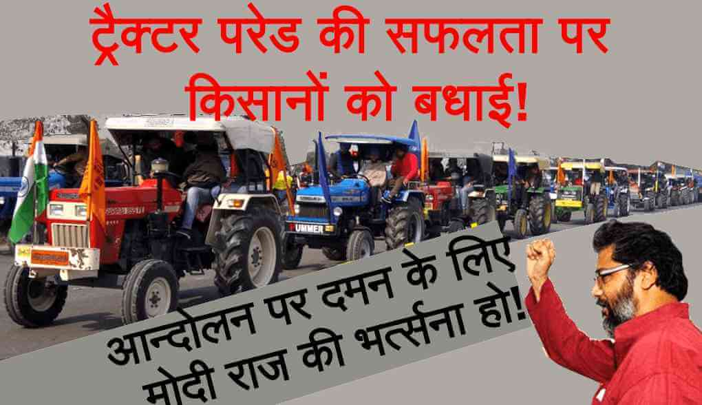देश के सभी कोने कोने से आये लाखों किसानों ने अश्रु गैस के गोले, पुलिसिया लाठीचार्ज समेत भारी दमन के बीच अपने ट्रैक्टरों पर सवार हो शान से तिरंगा लहराते हुए सड़कों पर आ कर भारत गणराज्य की लोकतांत्रिक भावना का उत्सव मनाया है. इस हिम्मत और दृढ़ निश्चय के लिए देश के किसान बधाई के पात्र हैं. हम पुलिस दमन की भर्त्सना करते हैं जिसमें एक किसान की जान चली गई.