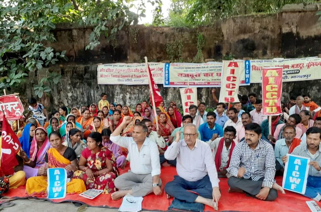 भागलपुर में 20 नवम्बर 2019 को बिहार राज्य निर्माण मजदूर यूनियन (बिरानिमयू) के बैनर तले निर्माण मजदूरों ने उपश्रमायुक्त कार्यालय के समक्ष धरना दिया. झंडे-बैनर व मांग पट्टिकाओं से लैस सैकड़ों महिला-पुरुष मजदूरों ने केंद्र-राज्य सरकार की मजदूर विरोधी नीतियों के खिलाफ रोषपूर्ण नारे लगाते हुए जबरदस्त विरोध जताया और केंद्र-राज्य सरकारों को कड़ी चेतावनी दी. यह ध्रना आॅल इंडिया कंस्ट्रक्शन वर्कर्स फेडरेशन (एआइसीडब्लूएफ) और ऐक्टू के आह्वान पर 21 नवम्बर 2019 को ‘आॅल इण्डिया प्रोटेस्ट डे’ के अवसर पर आयोजित था.