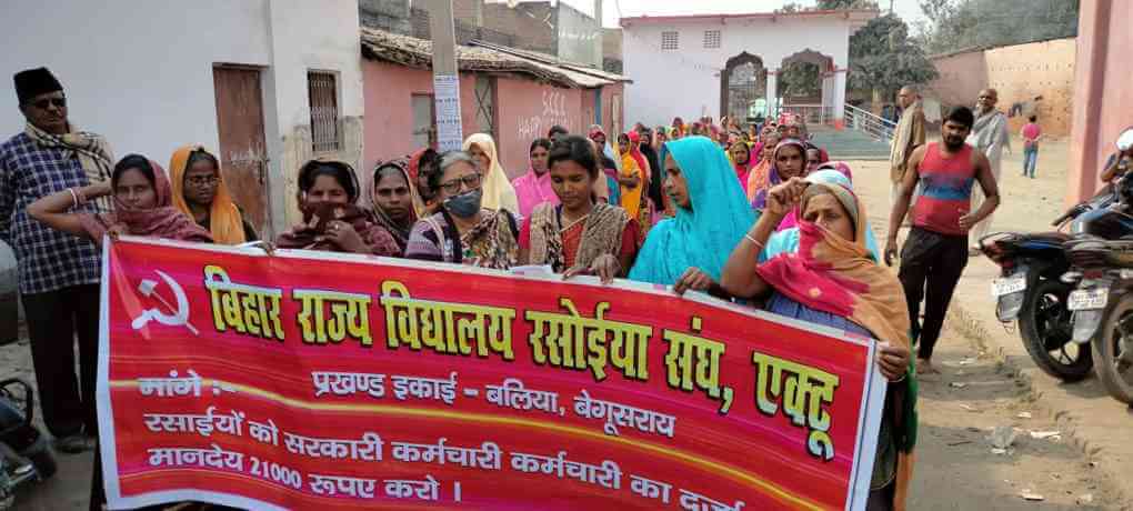 10 फरवरी 2021 को बेगूसराय जिले के बलिया स्थित अंबेडकर पार्क में बिहार राज्य विद्यालय रसोइया संघ (ऐक्टू से संबद्ध) की प्रखंड कमिटी द्वारा अपनी 11 सूत्री मांगों को लेकर धरना प्रदर्शन आयोजित किया गया.