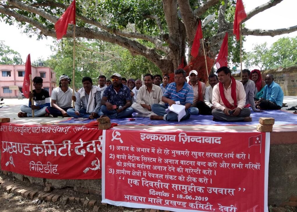 अनाज के अभाव में हो रही मौत के जिम्मेवार रघुवर सरकार शर्म करो, बायोंमीट्रिक्स सिस्टम को बन्द करो, ग्रमीण क्षेत्रों में पेयजल की व्यवस्था करो, आदि मांगों को लेकर गिरिडीह जिले में भाकपा(माले) की देवरी प्रखंड कमेटी के नेतृत्व में एक दिवसीय सामूहिक भूख हड़ताल की गई . कार्यक्रम की अध्यक्षता उस्मान जी और संचालन अजय चौधरी ने किया. उपस्थित आंदोलनकारियों को सम्बोधित करते हुए नौजवान सभा के प्रखण्ड अध्यक्ष सुनील रविदास, जमुआ विधानसभा के नेता अशोक पासवान, देवरी प्रखण्ड सचिव रामकिसुन यादव, मुस्तकीम अंसारी, सुनील राय आदि ने प्रशासन की लापरवाही और असंवेदनशीलता की निंदा की. कार्यकम में सैकड़ों लोग शामिल थे . का० मुस्तकीम ने कहा कि माले को हार जीत से कुछ फर्क नहीं पड़ता है. जहां माले को छोड़कर अन्य सभी पार्टियों ने अपना बोरिया-बिस्तर बांध चुप्पी साध ली है, वहीं माले रात-दिन जनता के कन्धे से कन्धे मिला कर चल रही है और लड़ रही है.