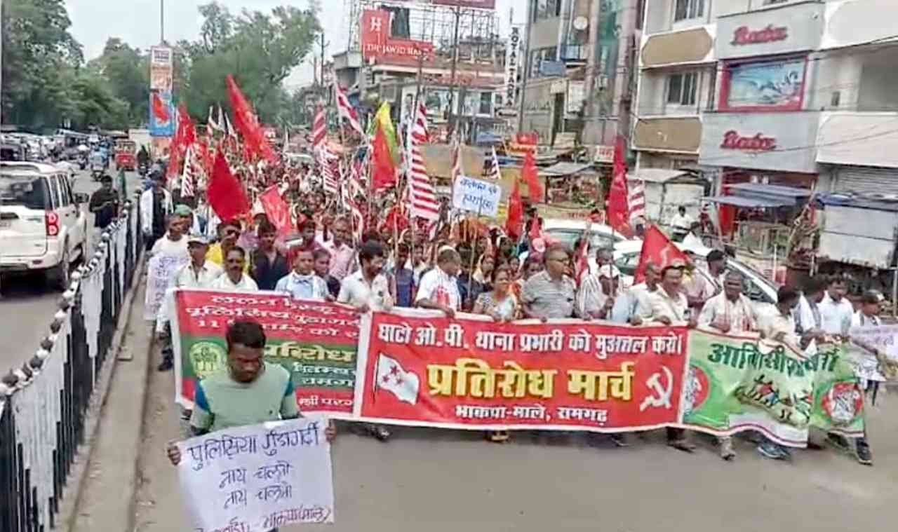 भाकपा(माले) रामगढ़ जिला कमेटी के आह्वान पर हजारों महिला-पुरुष और नौजवानों ने अपने हाथों में तीर-धनुष, झंडा-बैनर लेकर टमक की शंखनाद और जोशीले नारों के साथ जनाक्रोश प्रतिवाद मार्च निकाला. वे लोग ‘घाटो थाना प्रभारी को मुअत्तल करो, बर्खास्त करो और एसटीएसी मुकदमा दर्ज करो, रामगढ़ में पुलिसिया गुंडागर्दी नहीं चलेगी, पुलिस जुल्म के खिलाफ जनसंघर्ष तेज करो, पुलिस प्रशासन हाय-हाय’ आदि नारे लगा रहे थे.