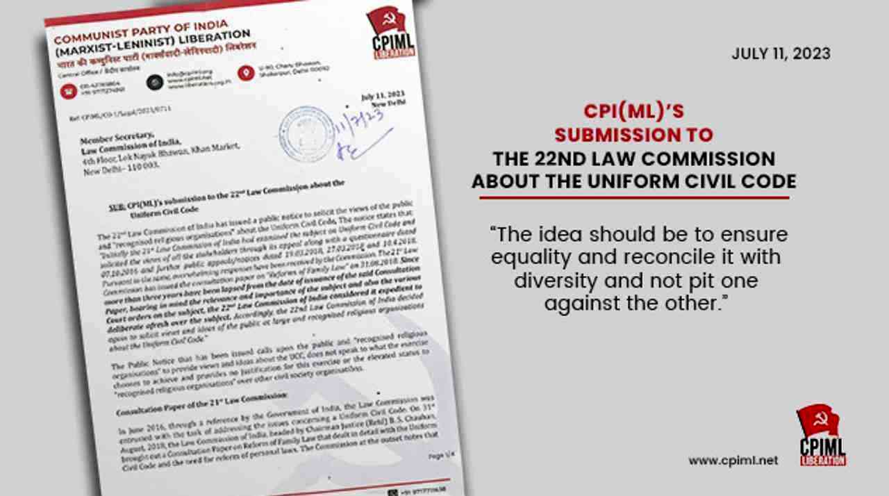 [ भाकपा(माले) महासचिव कामरेड दीपंकर भट्टाचार्य की ओर से विगत 11 जुलाई 2023 को समान नागरिक संहिता के संदर्भ में 22वें विधि आयोग के सदस्य सचिव को सौंपा गया प्रत्यावेदन ]