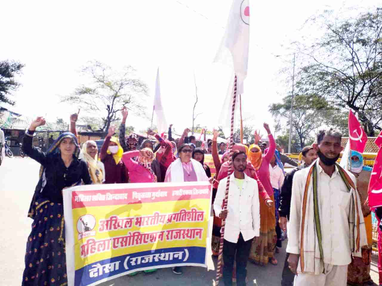 मजदूर संगठन ऐक्टू और महिला संगठन ऐपवा ने 16 फरवरी को दौसा में लेबर चौक से लेकर समाहरणालय तक एक मार्च आयोजित किया जिसके अंत में प्रतिवाद सभा की गई. इस मौके पर बोलते हुए ऐपवा की जयपुर जिला सचिव मंजुलता ने कहा कि रामनगर और सत्कार काॅलोनी जैसी बस्तियां दो दशकों से मौजूद हैं, लेकिन वहां पेय जल, सड़क, नाली, शिक्षा व स्वास्थ्य जैसी बुनियादी सुविधाओं का घोर अभाव है. इनमें से कुछ बस्तियां पंचायतों में और कुछ बस्तियां नगर निकायों के अंतर्गत आती हैं, और इन दानों की सीमाओं को लेकर लगातार विवाद चलते रहते हैं. इन बस्तियों के निवासी गरीब, दलित, आदिवासी और अन्य पिछड़ी पृष्ठभूमि से आते हैं, और वे अधिकांशतः असंगठित श्रम क्षेत्रों में काम करते हैं. वे लंबे समय से यहां रह रहे हैं, लेकिन कई परिवारों के राशन कार्ड खाद्य सुरक्षा से नहीं जुड़े हैं और यहां तक कि वोटर लिस्ट में भी उनके नाम नहीं हैं जिसके चलते स्थानीय राजनीति में उनकी कोई आवाज नहीं है.