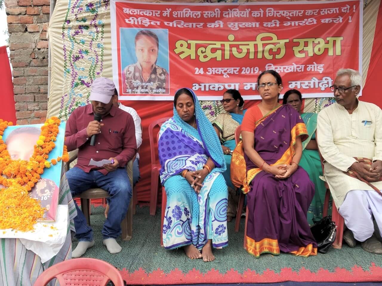 का. मीना तिवारी व का. रामेश्वर प्रसाद सहित सभी लोगों ने पूजा कुमारी के घर जाकर उनके शोक संतप्त परिजनों को ढांढ़स दिया और उनको न्याय दिलाने की लड़ाई को आगे बढ़ाने का विश्वास दिलाया. जनसभा को संबोधित करते हुए का. मीना तिवारी ने कहा कि जब पूरा देश दशहरे का जश्न मना रहा था, वहशी गुंडों ने घर में अकेली पाकर हमारी एक बहन, एक बेटी पूजा कुमारी के साथ बर्बर सामूहिक बलात्कार को अंजाम दिया और साक्ष्य मिटाने के लिए घृणित तरीके से उसकी हत्या कर दी. पूजा कुमारी ने वहशियों का जबरदस्त प्रतिकार किया और लड़ते-लड़ते शहीद हो गई. उन्होंने कहा कि साफ है कि सत्ता के संरक्षण में पल रहे ये अपराधी जदयू और भाजपा के हैं और उन्हें बचाने का प्रयास किया जा रहा है. उन्होंने घटना की उच्चस्तरीय न्यायिक जांच की मांग की.