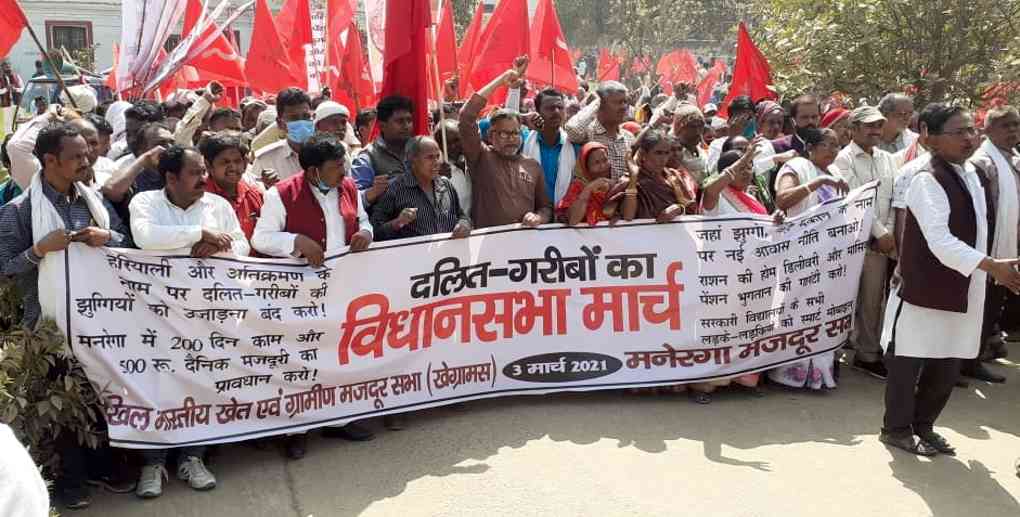 गांव से लेकर शहर तक नई आवास नीति बनाने के केंद्रीय नारे के साथ विगत 3 मार्च 2021 खेग्रामस व मनरेगा मजदूर सभा ने बिहार विधानसभा के समक्ष संयुक्त मार्च आयोजित किया. मार्च में हजारों की संख्या में दलित-गरीब ग्रामीण व मनरेगा मजदूर पटना पहुंचे. 12 बजे गेट पब्लिक लाइब्रेरी से हाथों में मांगों की तख्तियां लिए उन्होंने मार्च किया और गर्दनीबाग धरना स्थल पर सभा की. सभा में दोनों संगठनों के नेताओं के साथ ही भाकपा(माले) के सभी विधायक व अखिल भारतीय किसान महासभा के नेता भी शामिल हुए. मार्च में महिलाओं ने भी बढ़-चढ़कर हिस्सा लिया.