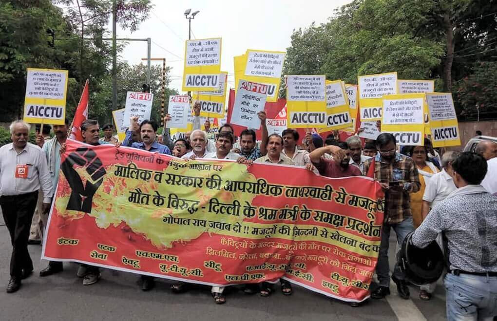 दिल्ली के औद्योगिक क्षेत्र में हो रही दुर्घटनाओं को रोकने की मांग करते हुए विगत 16 जुलाई को आल इंडिया सेंट्रल काउंसिल आॅफ ट्रेड यूनियंस (ऐक्टू) समेत अन्य श्रम संगठनों ने दिल्ली के श्रम मंत्री गोपाल राय के राज निवास के सामने प्रदर्शन किया.