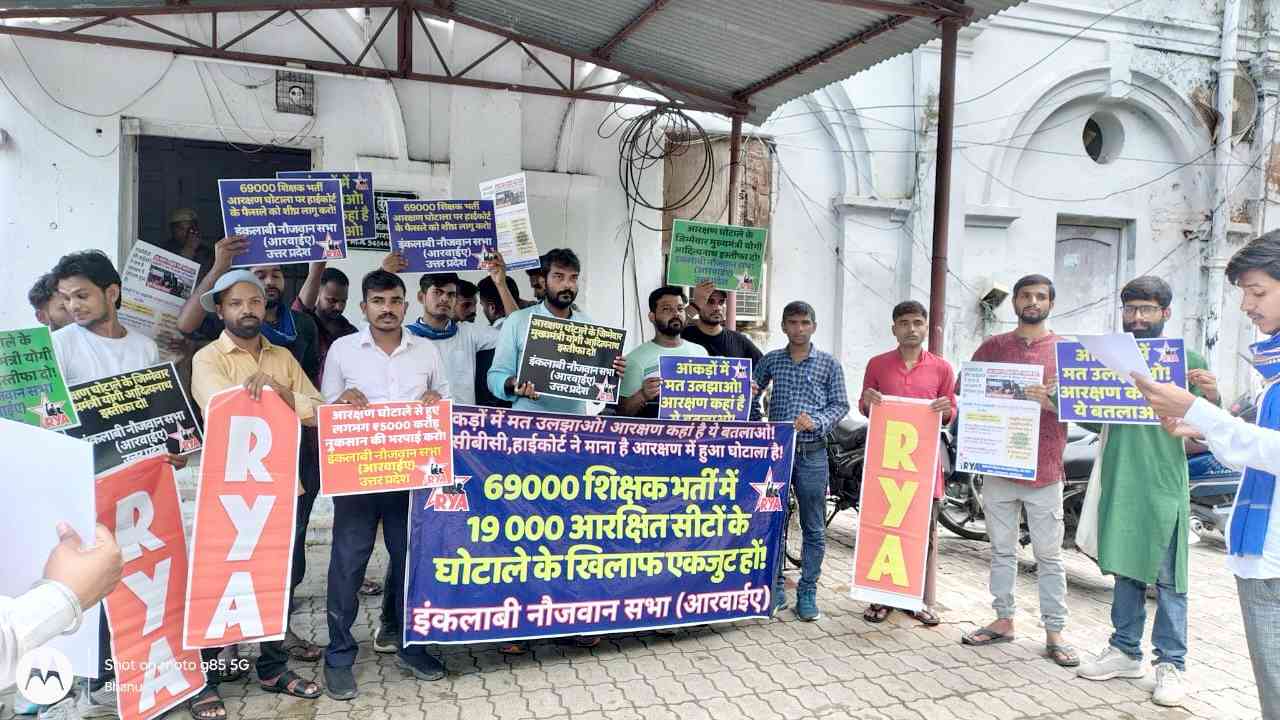 उच्च न्यायालय ने माना है कि शिक्षक भर्ती में आरक्षण घोटाला हुआ है. इंकलाबी नौजवान सभा की मांग है कि 69000 हजार शिक्षक भर्ती में हुए आरक्षण घोटाले पर उच्च न्यायालय के फैसले को शीघ्रता से लागू किया जाए. इसके लिए जिम्मेदार मंत्रियों-अधिकारियों को दंडित किया जाए. योग्यता के नाम पर ओबीसी-एससी समुदाय के अधिकारों का हनन करने वाली योगी सरकार को बर्खास्त किया जाए. 5000 करोड़ रु. के हुए नुकसान की भरपाई की जाए.