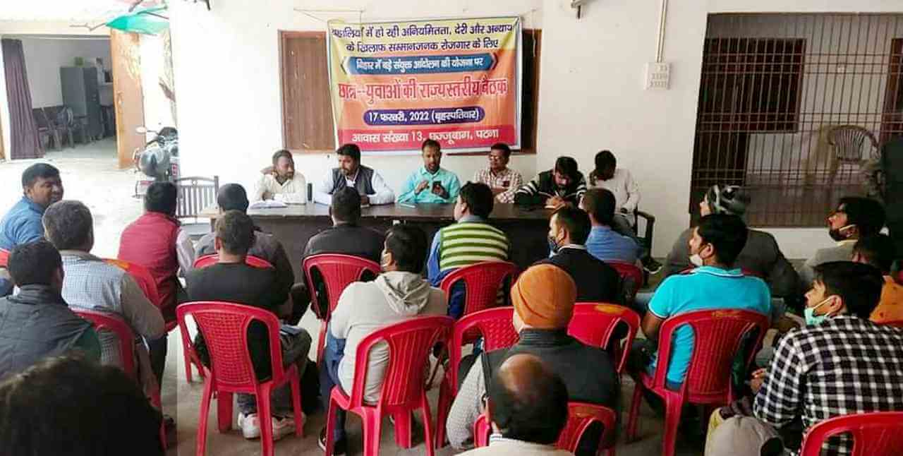 बहालियों में हो रही अनियमितता, देरी और अन्याय के खिलाफ सम्मानजनक रोजगार के लिए बिहार में बड़े संयुक्त आंदोलन की योजना पर छात्र-युवाओं की राज्यस्तरीय बैठक भाकपा(माले) विधायक दल कार्यालय छज्जूबाग में विगत 17 फरवरी 2022 को आयोजित की गई.