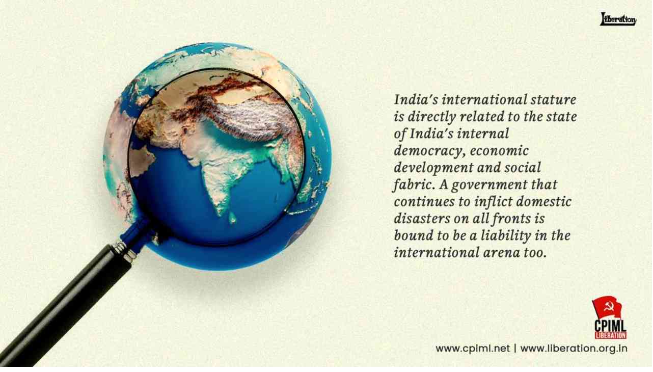 आगामी लोकसभा चुनाव के पहले भाजपा चौतरफा नाकामयाबी और गद्दारी से भरे मोदी सरकार के निराशाजनक कार्यकाल के प्रति लोगों के बढ़ते मोहभंग व आक्रोश का मुकाबला करने के लिए प्रधान मंत्री मोदी के समय भारत की बढ़ती वैश्विक हैसियत की झूठी छवि गढ़ने का पुरजोर प्रयास कर रही है. इस मिथ्या विमर्श को गढ़ने के लिए मोदी की ऑस्ट्रेलिया, अमेरिका और फ्रांस यात्राओं और जी-20 की अध्यक्षता को लेकर पूरा शोर-शराबा मचाया जाएगा. समृद्ध प्राकृतिक संसाधनों, प्रचुर मानव-शक्ति और विशाल बाजार के साथ दुनिया की सबसे बड़ी आबादी वाला देश होने के नाते भारत काफी लाभकारी स्थिति में है और वह वर्तमान अंतरराष्ट्रीय परिस्थिति में बड़ी भूमिका भी निभा सकता है. लेकिन इन लाभकारी स्थितियों का इस्तेमाल कर भारत को और भी शक्तिशाली लोकतंत्र तथा जन-केंद्रिक अर्थव्यवस्था के साथ-साथ वैश्विक न्याय, शांति व पृथ्वी की सुरक्षा के लिए मजबूत आवाज बनाने के बजाय मोदी सरकार दरअसल भारत को अमेरिका और उसके यूरोपीय संश्रयकारियों पर सामरिक निर्भरता तथा अपने तमाम निकटवर्ती पड़ोसियों के साथ बढ़ते अलगाव व शत्रुता में धकेल दे रही है. इसके अलावा, भारत की अंतरराष्ट्रीय हैसियत भारत के आंतरिक लोकतंत्र की स्थिति, आर्थिक विकास और सामाजिक तानेबाने के साथ सीधेसीधी जुड़ी हुई है. जो सरकार देश के अंदर सभी मोर्चों पर विपदा ही लाद रही हो, वह अंतरराष्ट्ररीय क्षेत्र में भी एक बोझ बनकर ही रह जाएगी.