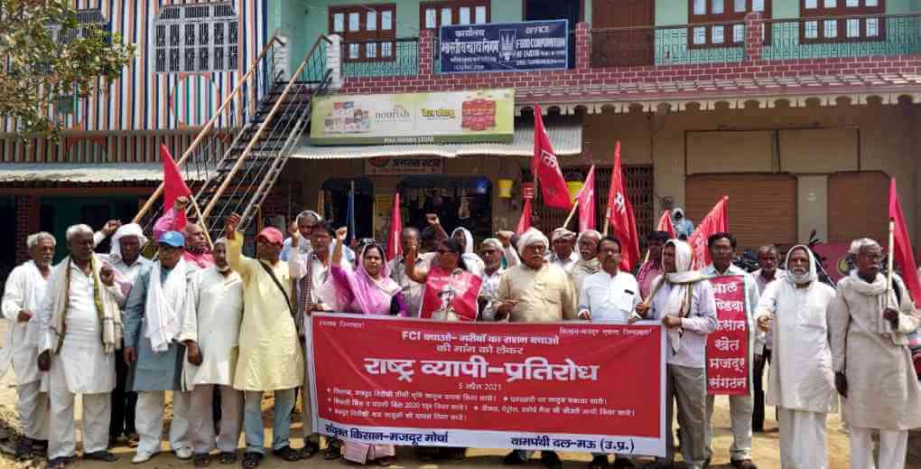 संयुक्त किसान मोर्चा के ‘एफसीआइ (भारतीय खाद्य निगम) बचाओ’ के आह्वान पर भाकपा(माले) व किसान महासभा ने विगत 5 अप्रैल 2021 को राज्यव्यापी धरना-प्रदर्शन आयोजित किया.