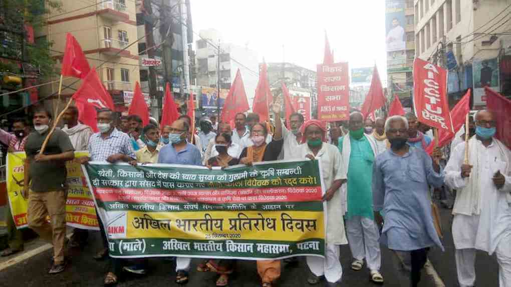 कसानों के हाथ से खेती छीनकर कारपोरेटों के हवाले कर देने वाले कृषि बिलों के खिलाफ किसान संगठनों के 25 सितंबर के राष्ट्रव्यापी प्रतिवाद के आह्वान पर पटना में भाकपा(माले) महासचिव काॅ. दीपंकर भट्टाचार्य और अखिल भारतीय किसान महासभा के महासचिव व पूर्व विधायक राजाराम सिंह सहित सैकड़ों भाकपा(माले) और किसान सभा कार्यकर्ता सड़क पर उतरे और अपना प्रतिवाद दर्ज किया.