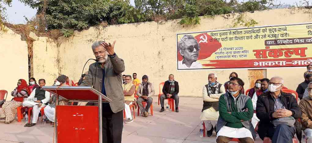 18 दिसंबर 2020 को का. विनोद मिश्र के 22 वें स्मृति दिवस पर पटना के भारतीय नृत्य कला मंदिर के मुकताकाश में आयोजित संकल्प सम्मेलन ने खेत-खेती-किसानी पर कारपोरेट गुलामी थोपने की मोदी सरकार की कोशिशों के खिलाफ जनता के निर्णायक संघर्ष का उद्घोषणा की. संकल्प सभा ने आगामी 29 दिसंबर को बिहार में किसानों के राजभवन मार्च को ऐतिहासिक बनाने के संकल्प के साथ देश भर में जारी किसान आंदोलन को बिहार में एक नई उफंचाई पर पहुंचाने तथा न्यूनतम समर्थन मूल्य पर धान खरीद की गारंटी पर नीतीश सरकार को घेराव करने का भी ऐलान किया. सम्मेलन के मुख्य वक्ता भाकपा(माले) महासचिव काॅ. दीपंकर भट्टाचार्य के अलावा वरिष्ठ नेता स्वदेश भट्टाचार्य, चर्चित कम्युनिस्ट नेता रामदेव वर्मा व मंजू प्रकाश (माकपा के पूर्व विधायक) सहित पार्टी के राज्य नेताओं, विधायकों व बिहार के तमाम जिलों से आए पार्टी कार्यकर्ताओं ने का. विनोद मिश्र को दो मिनट की मौन श्रद्धांजलि दी. सभा की अध्यक्षता पार्टी के पोलित ब्यूरो के सदस्य का. धीरेन्द्र झा, पूर्व सांसद रामेश्वर प्रसाद, वरिष्ठ पार्टी नेता केडी यादव, महिला नेत्री का. सरोज चैबे व का. अनवर हुसैन ने की. हिरावल, जसम द्वारा शहीद गान व भाकपा(माले) राज्य सचिव का. कुणाल द्वारा पार्टी की केंद्रीय कमिटी की ओर से जारी संकल्प दिवस आह्वान के के पाठ के साथ सभा शुरू हुई.