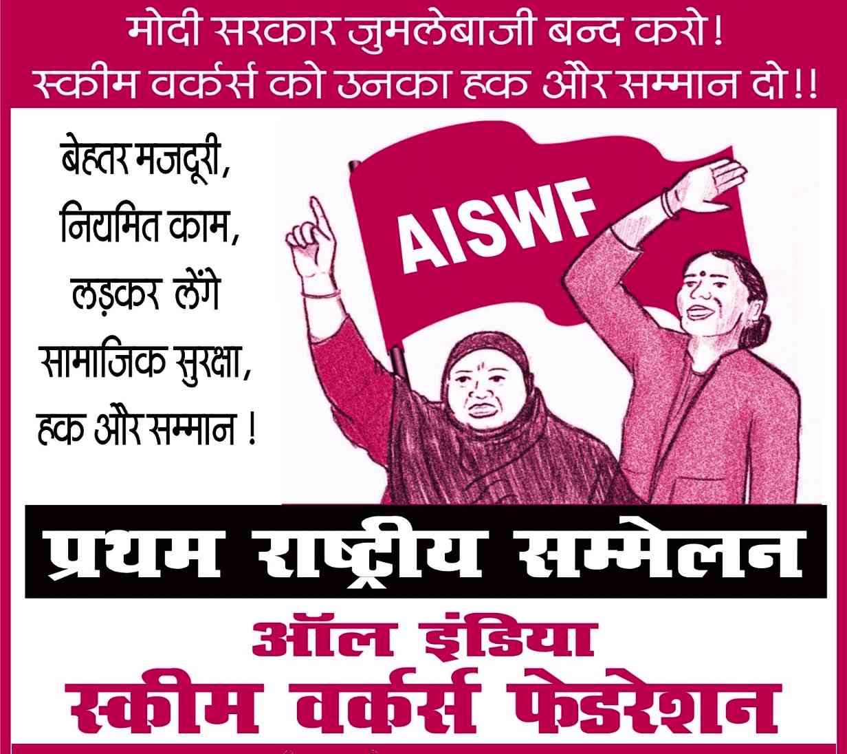 ‘बेहतर मजदूरी, नियमित काम – लड़कर लेंगे सामाजिक सुरक्षा, हक और सम्मान’ के केंद्रीय नारे के साथ स्कीम कर्मियों (आशा, मिड-डे मील, आंगनबाड़ी, आदि) को सरकारी कर्मचारी का दर्जा देने, केंद्र सरकार की जुमलेबाजी बंद करने और स्कीम वर्कर्स को उनका हक और सम्मान देने की मांग तथा सांप्रदायिक घृणा व बंटवारे और कंपनी राज के खिलाफ संघर्ष तेज करते हुए 2024 के आम चुनावों में विनाशकारी मोदी शासन को शिकस्त देने के संकल्प के साथ आगामी 8-10 सितंबर 2023 को बिहार की राजधानी पटना में ऑल इंडिया स्कीम वर्कर्स फेडरेशन (एआईएसडब्ल्यूएफ) का पहला राष्ट्रीय सम्मेलन आयोजित हो रहा है.