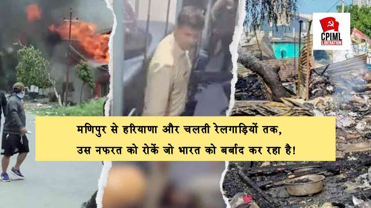 पांच वर्ष पूर्व 2019 के चुनावों के पहले मोदी शासन और संघ-भाजपा ब्रिगेड के फासीवादी हमले के खिलाफ जनाक्रोश के स्पष्ट चिन्ह दिख रहे थे. भाजपा राजस्थान, मध्य प्रदेश और छत्तीगढ़ के अपने मजबूत राज्यों में विधानसभा चुनाव हार गई थी. उसी के बाद पुलवामा हुआ था जिसमें सीआरपीएफ के 40 जवान एक आतंकी हमले में मारे गए थे, और फिर चुनावी परिदृश्य नाटकीय रूप से बदल गया. आज देश जान रहा है कि अनेकानेक स्पष्ट चूकों के जरिये कैसे पुलवामा को घटित होने दिया गया था, और कैसे खुद प्रधान मंत्री ने जम्मू-कश्मीर के तत्कालीन राज्यपाल सत्यपाल मलिक को सरकार की उस विफलता पर खामोश रहने का निर्देश दिया था. आगामी चुनावों के पहले जनता का मोहभंग कहीं ज्यदा गहरा हो गया है और नफरत व झूठ, भय और विनाश के मौजूदा राज से मुक्ति की चाहत भी जमीन पर बढ़ती दिख रही है. नफरत और हिंसा की यह मुहिम सामाजिक धु्रवीकरण को धारदार बनाने और अस्थिरता का माहौल तैयार करने की मंशा से ही तेज की गई है, ताकि बदलाव की लोकप्रिय आकांक्षा को भटका दिया जा सके. मणिपुर से हरियाण तक चेतावनी की घंटी बिल्कुल साफ सुनाई दे रही है. हम भारत के लोग को इस चाल में बिल्कुल नहीं फंसना होगा और बदलाव की लड़ाई को जीत की मंजिल तक ले जाना होगा.