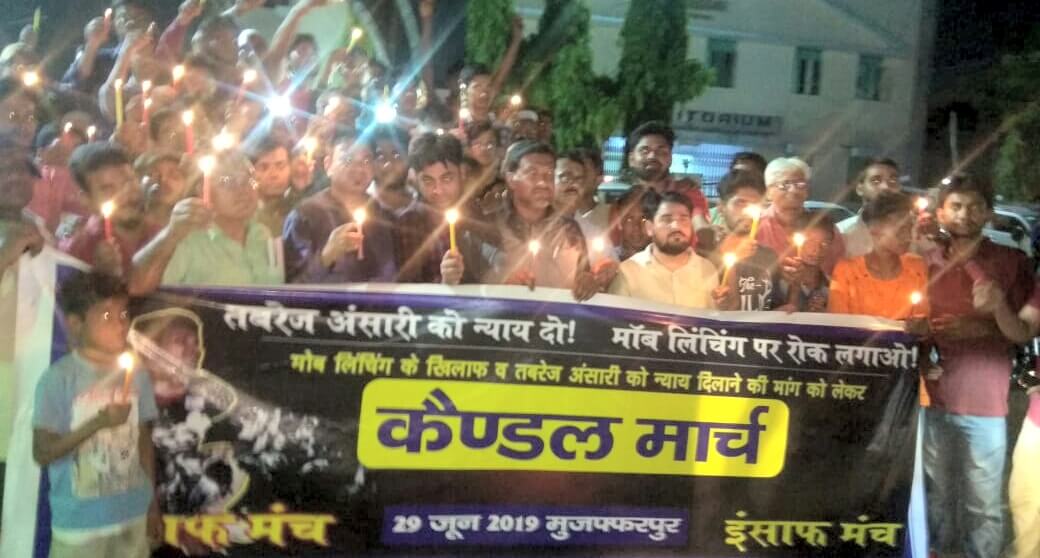 तबरेज अंसारी माॅब लिंचिंग के खिलाफ मुजफ्फरपुर में विगत दिनों इंसाफ मंच के बैनर से कैंडल मार्च निकाला गया. पक्कीसराय चौक से जुब्बा सहनी पार्क तक निकाले गए मार्च में बड़ी संख्या में नागरिक शामिल हुए और तबरेज को श्रद्धांजलि दी. इसके बाद वक्ताओं ने पीड़ित परिवार के एक सदस्य को नौकरी व दस लाख मुआवजा देने की भी मांग की. मार्च में गोरखपुर बीआरडी अस्पताल के डाॅक्टर कफील भी शामिल हुए. आइसा ने विगत 30 जून 2019 को प्रतिवाद मार्च निकाला. आइसा की जिला संयोजक व एमजेके काॅलेज छात्र संघ की पूर्व महासचिव निखिता कुमारी ने इसका नेतृत्व किया. सभा में मुना कुमार, जोखू चौधरी, विनय प्रभाकर, कुंदन मंगलम, गयासुद्दीन आदि शामिल हुए.