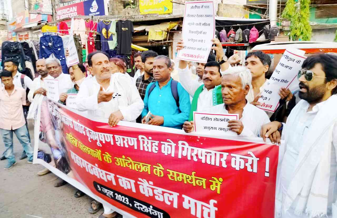 5 जून 2023 को बिहार के दरभंगा के टावर चैक पर महागठबंधन के विभिन्न दलों – भाकपा(माले), राजद, कांग्रेस, जेडीयू तथा अन्य वामपंथी दलों द्वारा देश के नामचीन महिला पहलवानों के आंदोलन के समर्थन में तथा भारतीय कुश्ती संघ के अध्यक्ष और भाजपा सांसद ब्रृज भूषण शरण सिंह को अविलंब गिरफ्तार करने की मांग को लेकर विरोध प्रदर्शन तथा कैंडिल मार्च का आयोजन किया गया.