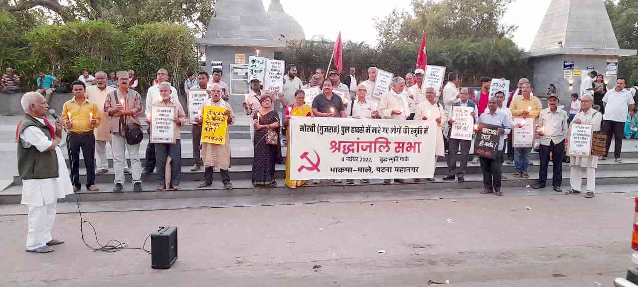 गुजरात के मोरबी पुल हादसे में मारे गए लोगों की स्मृति में 4 नवंबर 2022 को पटना के बुद्ध स्मृति पार्क के पास भाकपा(माले) की पटना महानगर कमिटी की ओर से श्रद्धांजलि सभा का आयोजन किया गया. भाकपा(माले) कार्यकर्ताओं व आम नागरिकों ने एक मिनट का मौन रखकर और कैंडिल जलाकरसभी मृतकों को अपनी श्रद्धांजलि दी. कुछ दिनों पहले पटना के जाने-माने फोटोग्राफर एपी दुबे और उसी दिन दरभंगा में भाकपा(माले) के वरिष्ठ नेता कॉ. लक्ष्मी पासवान की भी मौत हो गई. कार्यकर्ताओं ने उन दोनों को भी अपनी श्रद्धांजलि दी.