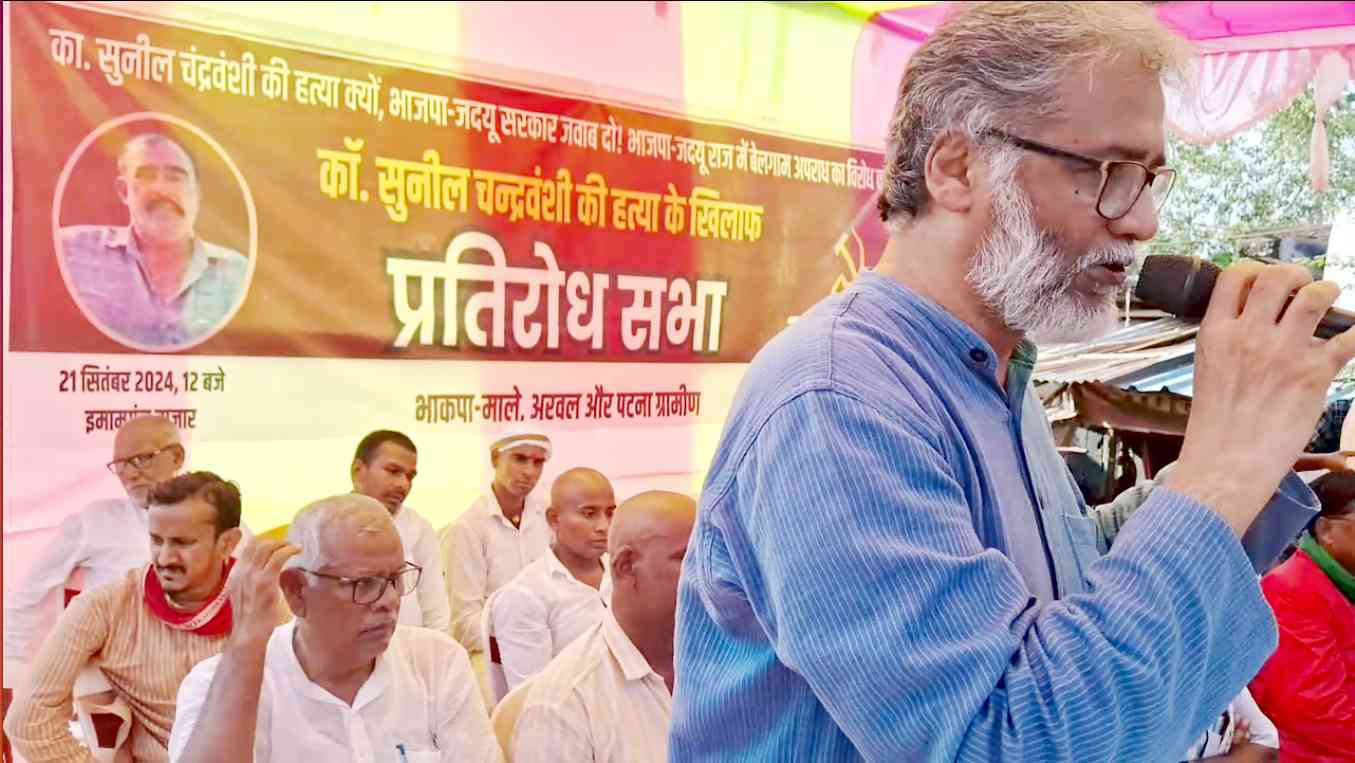 प्रतिरोध सभा में आरा सांसद का. सुदामा प्रसाद ने पूछा कि का. सुनील चंद्रवंशी के हत्यारे को अभी तक गिरफ्तार क्यों नहीं किया गया? उन्होंने मोदी सरकार द्वारा लाए गए तीन आपराधिक कानूनों की चर्चा की. कहा कि ये कानून अपराधियों को संरक्षण देने वाले कानून हैं. इससे अपराधियों का मनोबल बढ़ रहा है. राजू-जुम्मन गिरोह की कुर्की जब्त क्यों नहीं हो रही है? उन्होंने आरोप लगाया कि सरकार अपराधियों को बचाने में लगी हुई है. पालीगंज विधायक संदीप सौरभ ने कहा कि का. सुनील चंद्रवंशी के हत्यारे को सब लोग जान रहे हैं. अपराध का उसका पुराना इतिहास है लेकिन वे आराम से बाहर घूम रहे हैं. इसलिए हम कह रहे हैं कि यह सत्ता के संरक्षण में की गई हत्या है. आंदोलनकारी ताकतों को कुचलने के लिए भाजपा-जदयू की सरकार ऐसी ताकतों को संरक्षण देती है. उन्होंने कहा कि हमारे आंदोलनों के दबाव में इमामगंज में थाना तो बन गया लेकिन काम नहीं हो रहा है. थाना अपराधियों को गिरफ्तार करने नहीं आती बल्कि आंदोलनकारियों को दबाने आती है. पुलिस और अपराधियों के गठजोड़ की जांच होनी चाहिए. फुलवारी विधायक का. गोपाल रविदास ने कहा कि नीतीश कुमार विकास की बात करते नहीं थकते लेकिन जब महागठबंधन की सरकार थी हमने दबाव देकर सामाजिक आर्थिक सर्वेक्षण कराया. उस सर्वेक्षण में 95 लाख से ज्यादा परिवार महागरीब हैं. व्यापक पैमाने पर लोगों के पास रहने के लिए जमीन नहीं है इसलिए हम लोग हक दो-वादा निभाओ अभियान चला रहे हैं. इस अभियान की तैयारी में का. सुनील चंद्रवंशी की हत्या की गई. इससे साफ जाहिर है कि भाजपा-जदयू की सरकार गरीबों को कोई अधिकार नहीं देना चाहती. इस सरकार को सबक सिखाना होगा. घोसी विधायक रामबली सिंह यादव ने सवाल उठाया कि अपराधियों को ताकत कहां से मिलती है? अपराधी को बचाने के लिए कानून बदल जाते हैं लेकिन टाडा में बंद हमारे साथियों की सजा काट लेने के बाद भी रिहाई नहीं होती. इसलिए उनका साहस बढ़ रहा है. प्रतिरोध सभा को पूर्व जिला पार्षद मधेश्वर प्रसाद, वर्तमान जिला पार्षद शाह शाद, ऐपवा की जिला सचिव लीला वर्मा, रामाधार सिंह, अनवर हुसैन, सहार के पूर्व प्रमुख मदन सिंह, पूर्व जिला पार्षद रवीन्द्र यादव आदि नेताओं ने भी संबोधित किया. मंच पर अरवल जिला सचिव का. जितेन्द्र यादव, जमीला खातून सहित कई लोग उपस्थित थे.
