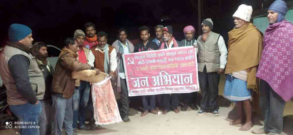 जमुआ प्रखंड के गोपीडीह में बैठक आयोजित हुई और घर-घर से धान इकट्ठा किया गया. देवरी प्रखंड के गरंग गांव में (भेलवा घाटी पंचायत) का. मुस्तकीम अंसारी व सुनील रविदास के नेतृत्व में धान संग्रह अभियान चलाया गया. इसी प्रखंड के फतेहपुर यादव टोला में रामकिशुन यादव, नुनेश्वर यादव, भोला यादव व दुलारचंद यादव आदि की अगुआई में जन अभियान चलाया गया. बेंगाबाद प्रखंड के बारासोली में हुई बैठक में किसान विरोधी कानूनों को वापस लेने की मांग पर आयोजित हो रहे मानव श्रृंखला कार्यक्रम में सफल करने का निर्णय लिया गया.