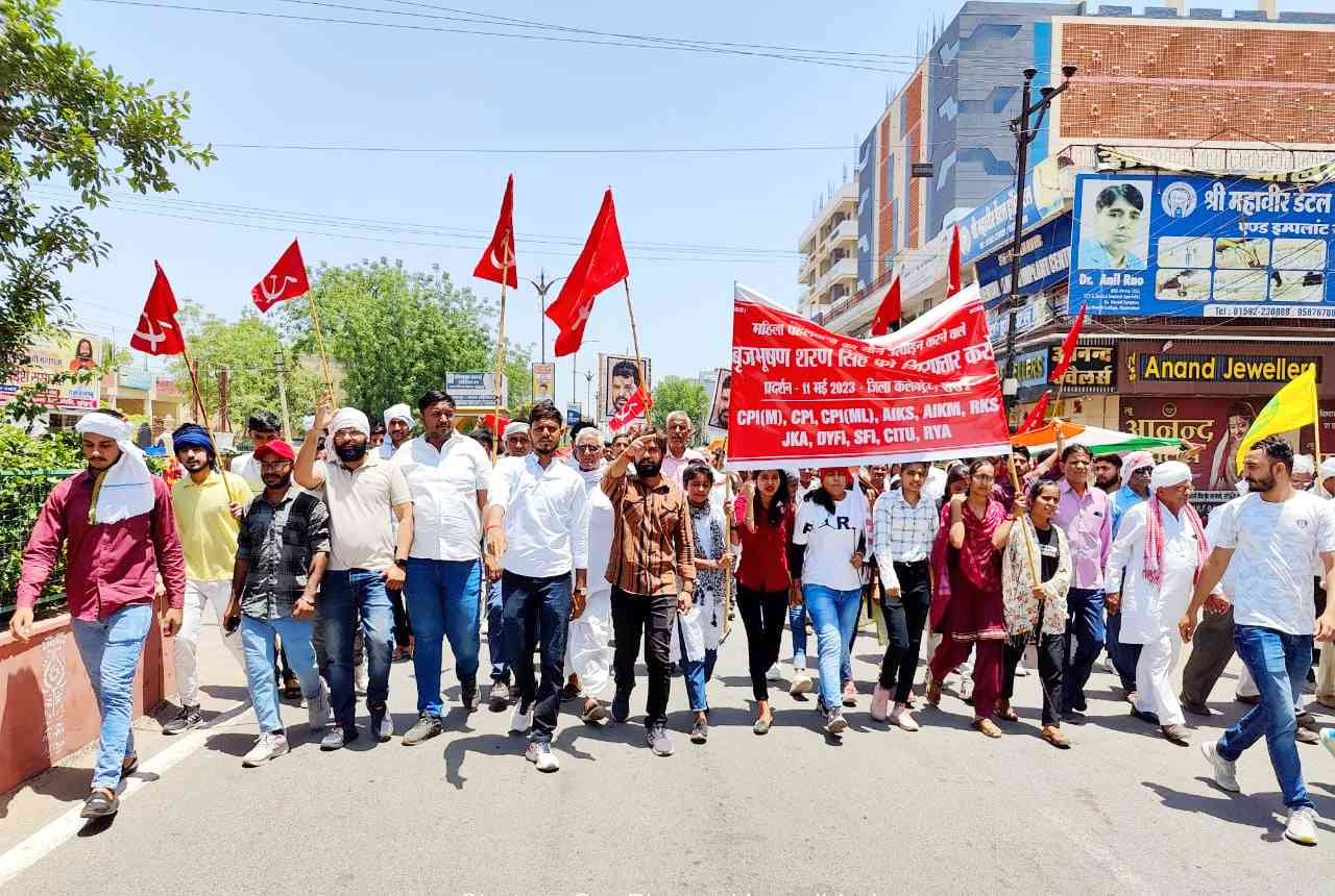 झुंझुंनू , 11 मई 2023 : भाकपा(माले), भाकपा, माकपा, अखिल भारतीय किसान सभा, अखिल भारतीय किसान महासभा, जय किसान आंदोलन, राजस्थान किसान सभा, एसएफ आई, डीवाईएफआई, सीटू व इंकलाबी नौजवान सभा की तरफ से शिक्षक भवन, झुंझुंनू से कलेक्ट्रेट तक रैली निकाली गई. रैली में ‘बृजभुषण शरण सिंह को अधयक्ष पद से बर्खात कर गिरफ्तार करो’, ‘मोदी सरकार होश में आओ, ‘बलात्कारियों को संरक्षण देना बंद करो’ आदि नारे लगा रहे थे. कलेक्ट्रेट पहुंचकर विरोध सभा की गई.