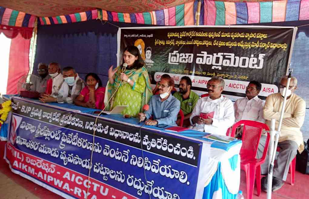 जनपंचायत को संबोधित करते हुए आइसा नेता और दिल्ली बाॅर्डर किसान आंदोलन के अखबार ‘ट्राॅली टाइम्स’ की संपादक नवकिरण नत्त ने कहा कि केन्द्र सरकार को तीन कृषि कानूनों और विशाखा स्टील प्लांट के निजीकरण के प्रस्ताव को वापस ले लेना चाहिए. ये दोनों ही निर्णय उसकी जन विरोधी नीतियों को सामने लाते हैं.