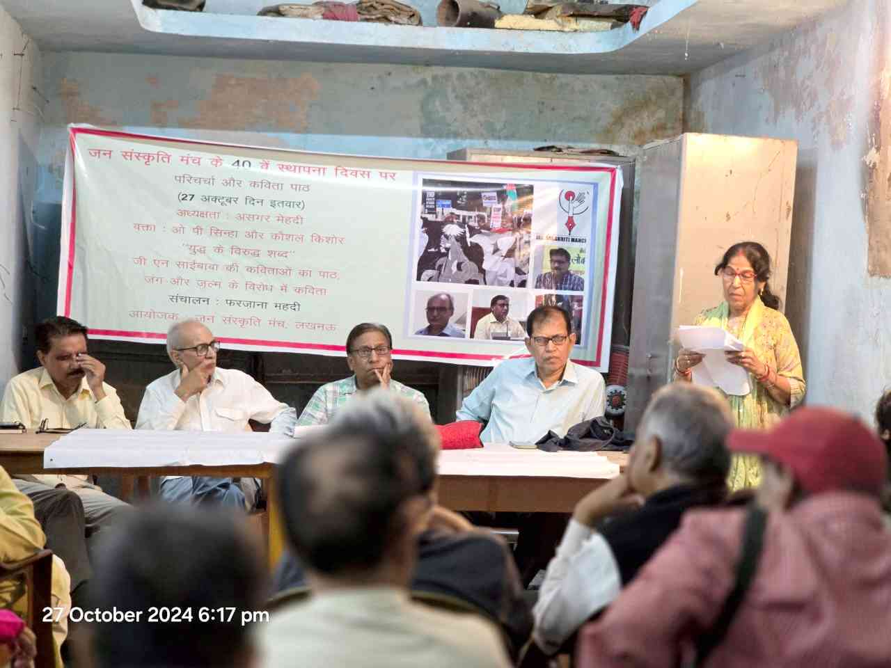 जन संस्कृति मंच के स्थापना दिवस (28 अक्टूबर) के मौके पर इप्टा कार्यालय, कैसरबाग, लखनऊ में जंग और जुल्म के विरोध में परिचर्चा और कविता पाठ का आयोजन किया गया. इसकी अध्यक्षता जसम लखनऊ के कार्यकारी अध्यक्ष जाने-माने लेखक तथा ‘तज़किराष’ के प्रधान संपादक असगर मेहदी ओर संचालन जसम की लखनऊ इकाई के सचिव कथाकार फरजाना मेहदी ने की. कार्यक्रम के आरंभ में कलीम खान ने प्रो. जीएन साईबाबा की दो कविताएं. ‘मैंने मरने से इन्कार किया’ और ‘आजादी’ सुनाईं.